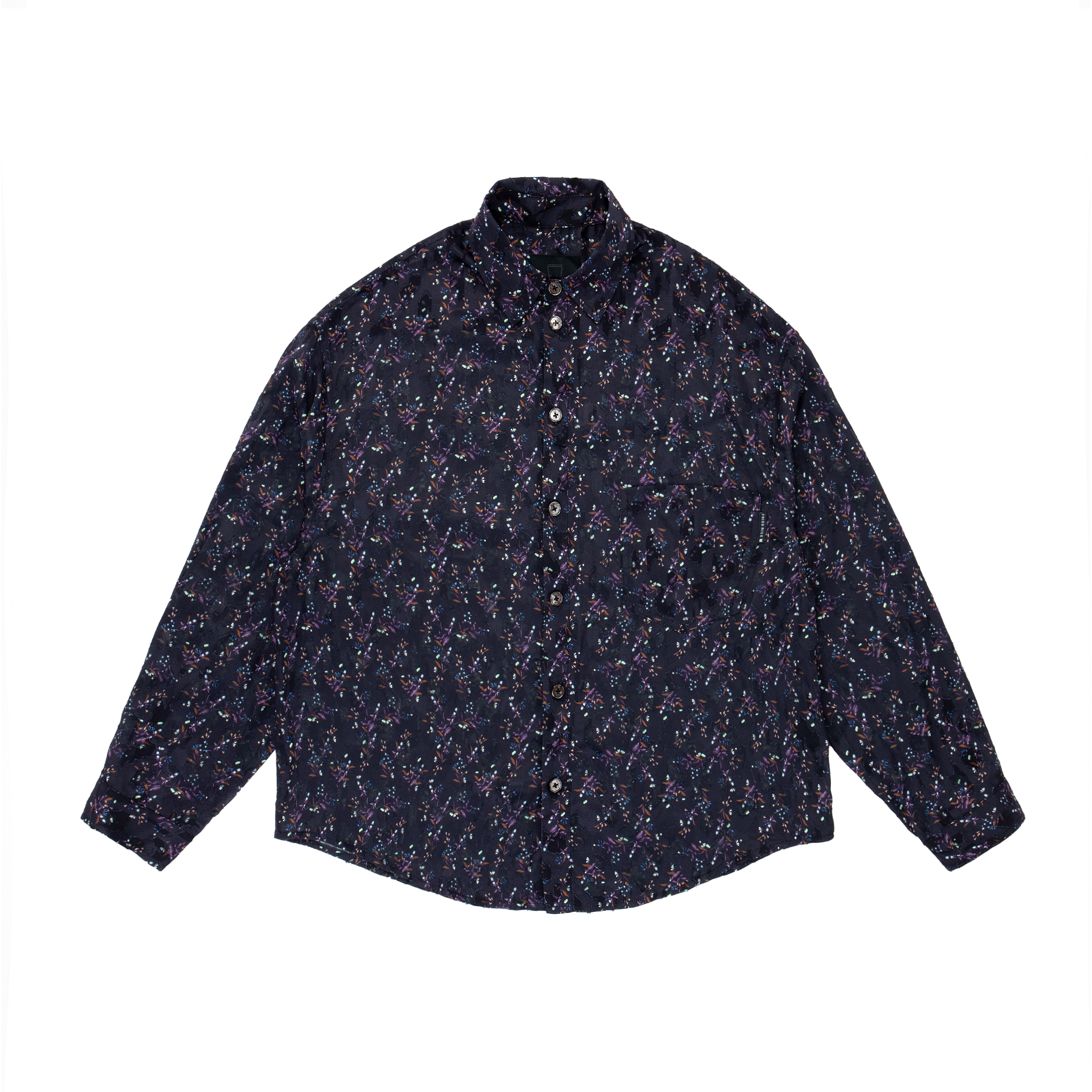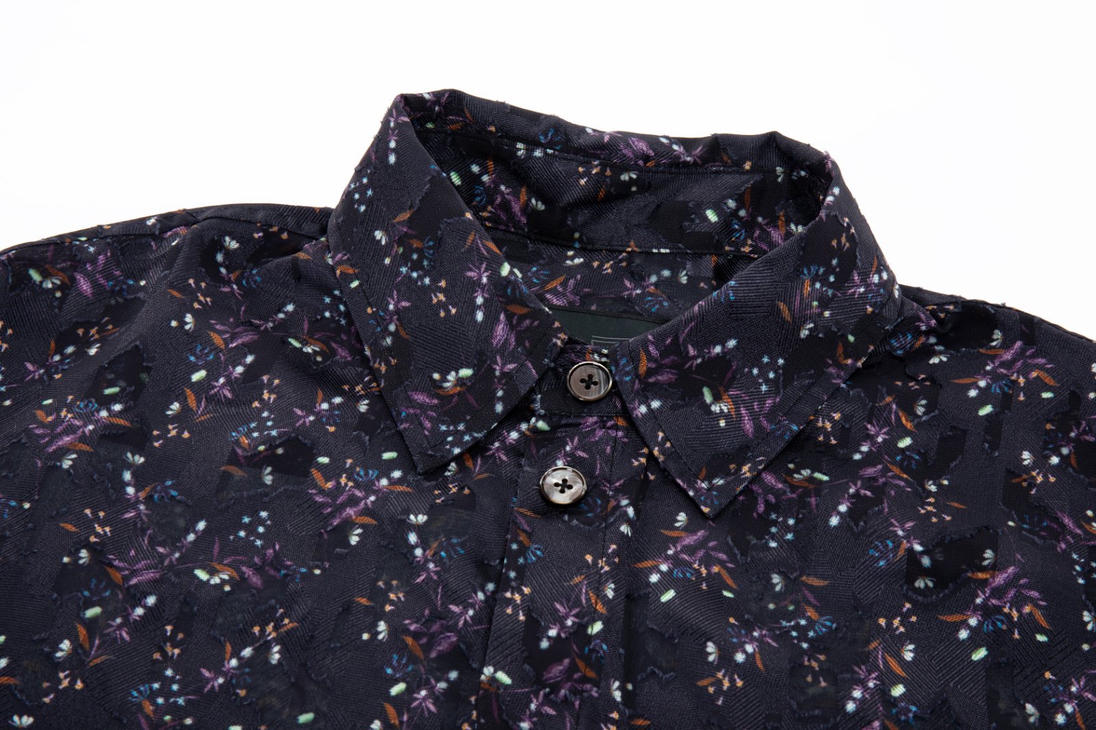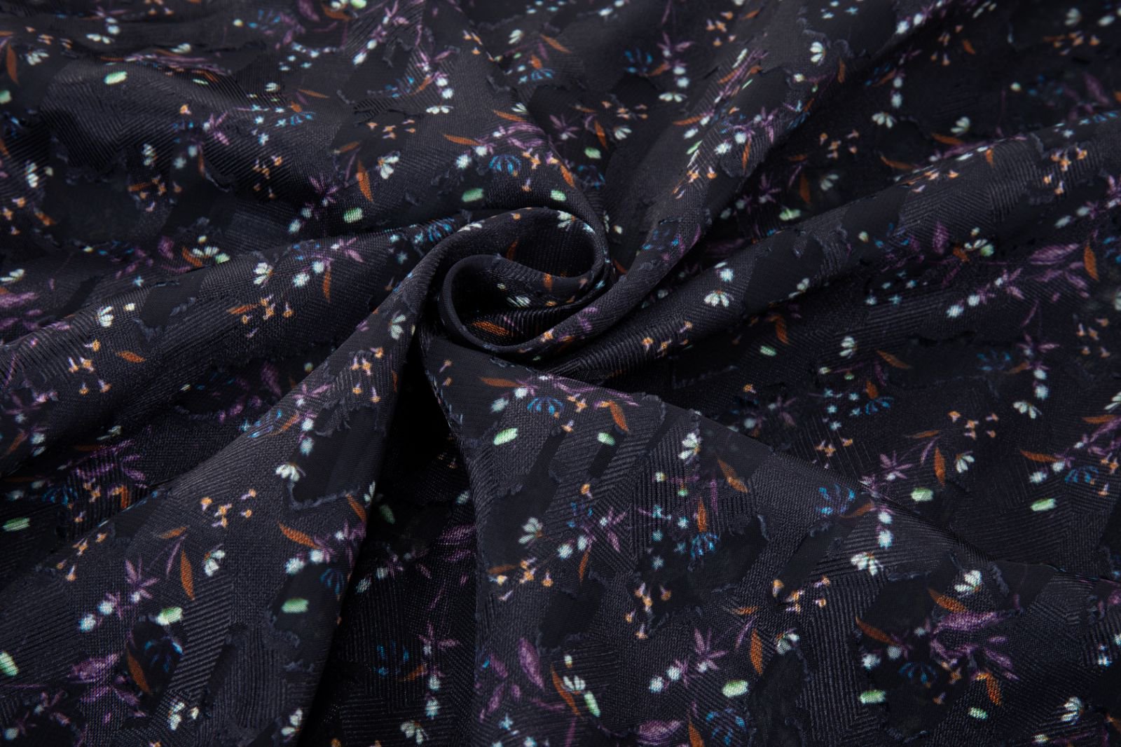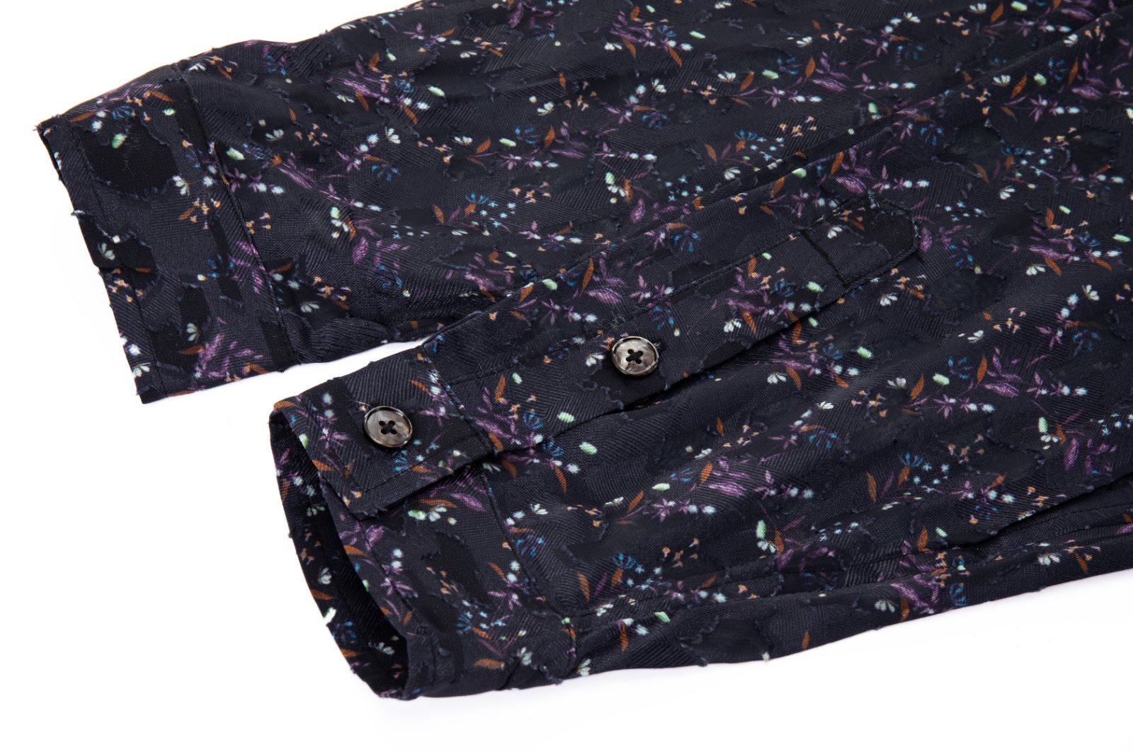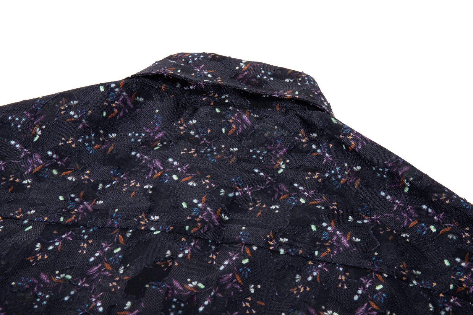 All-over violet print with abstract floral motifs set against deep tonal layers