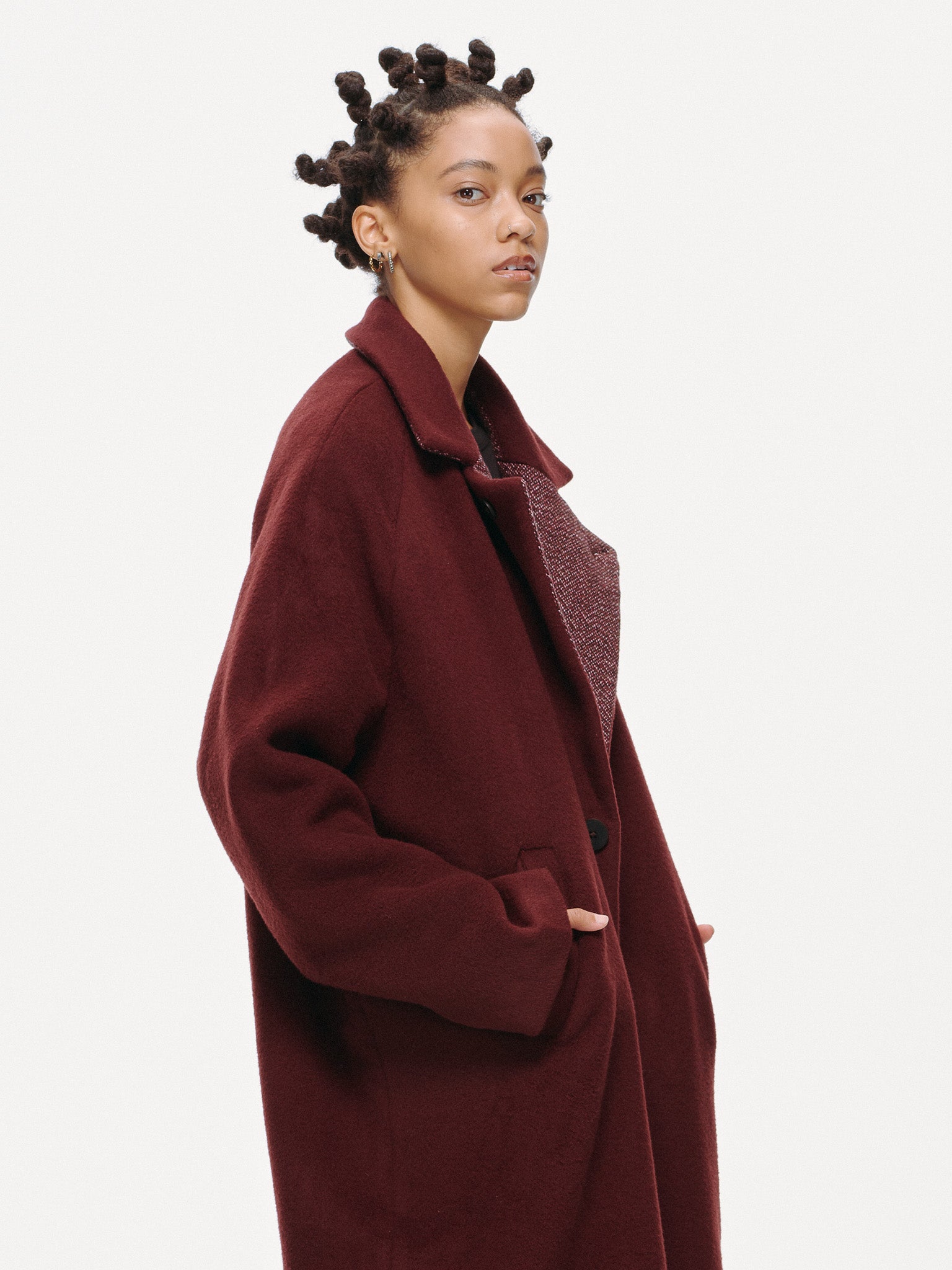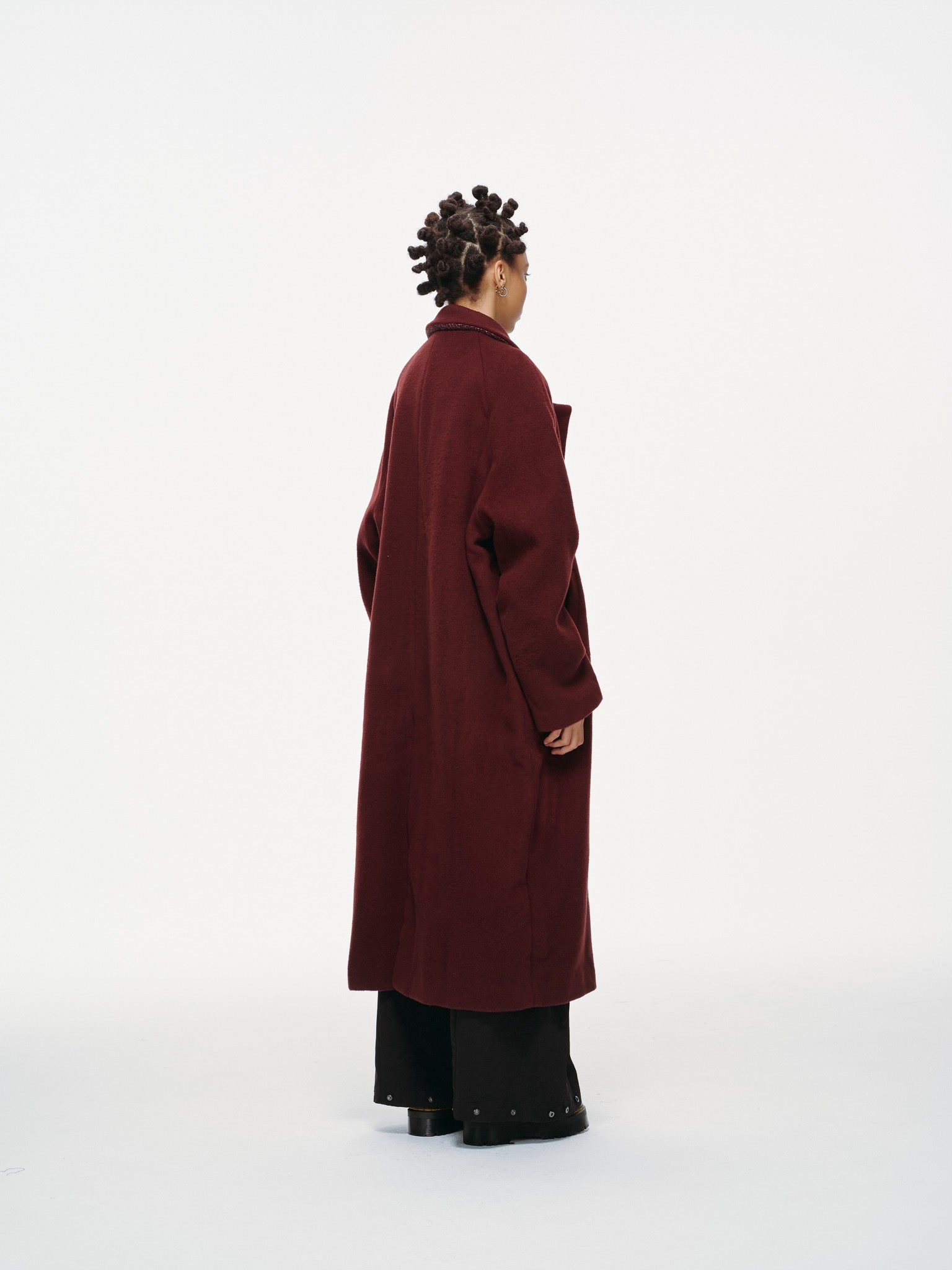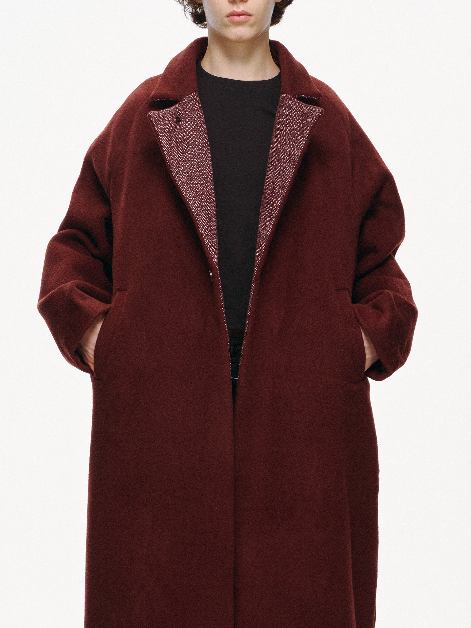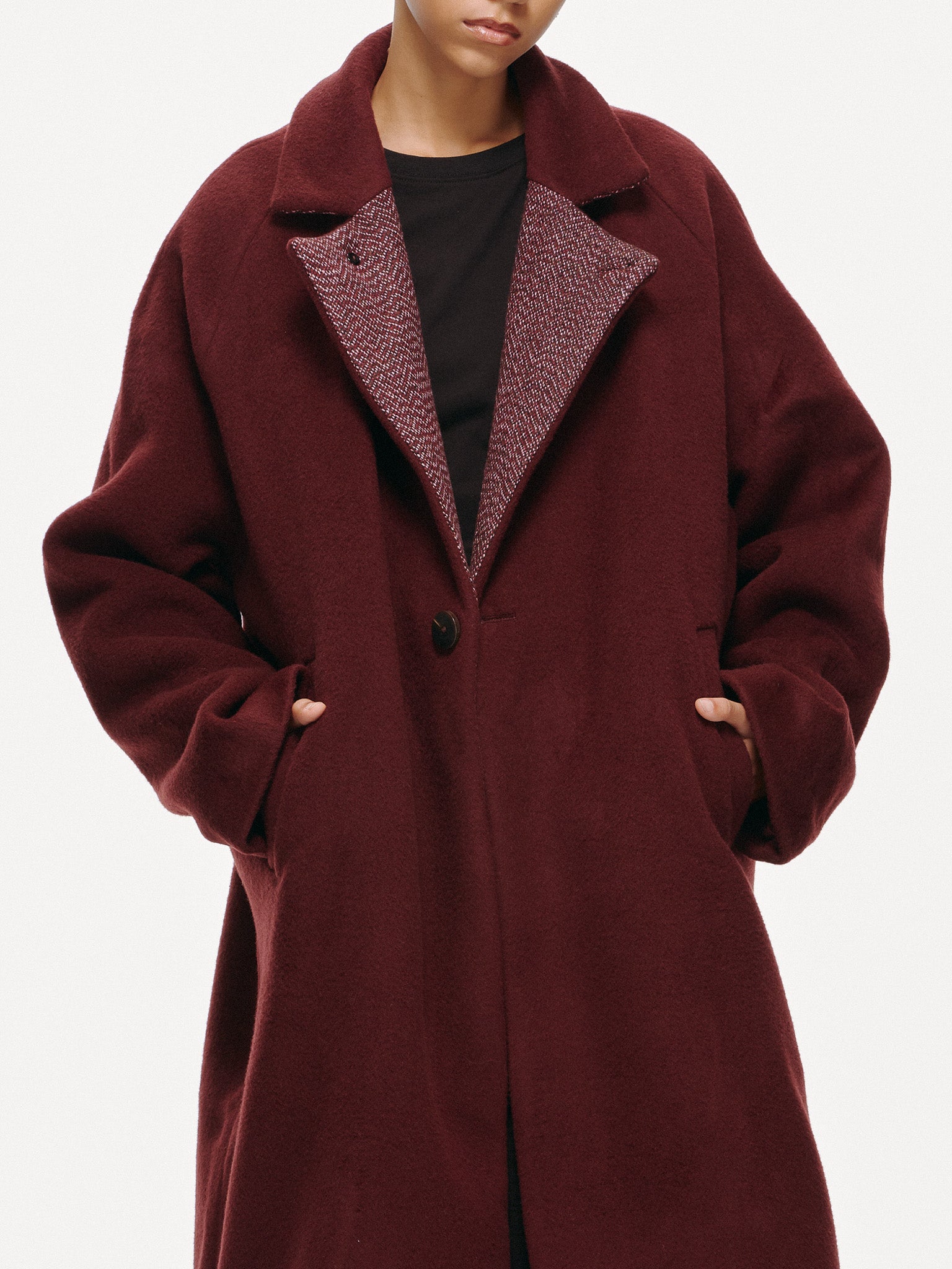 Full-length oversized wool coat in deep burgundy oxblood tone