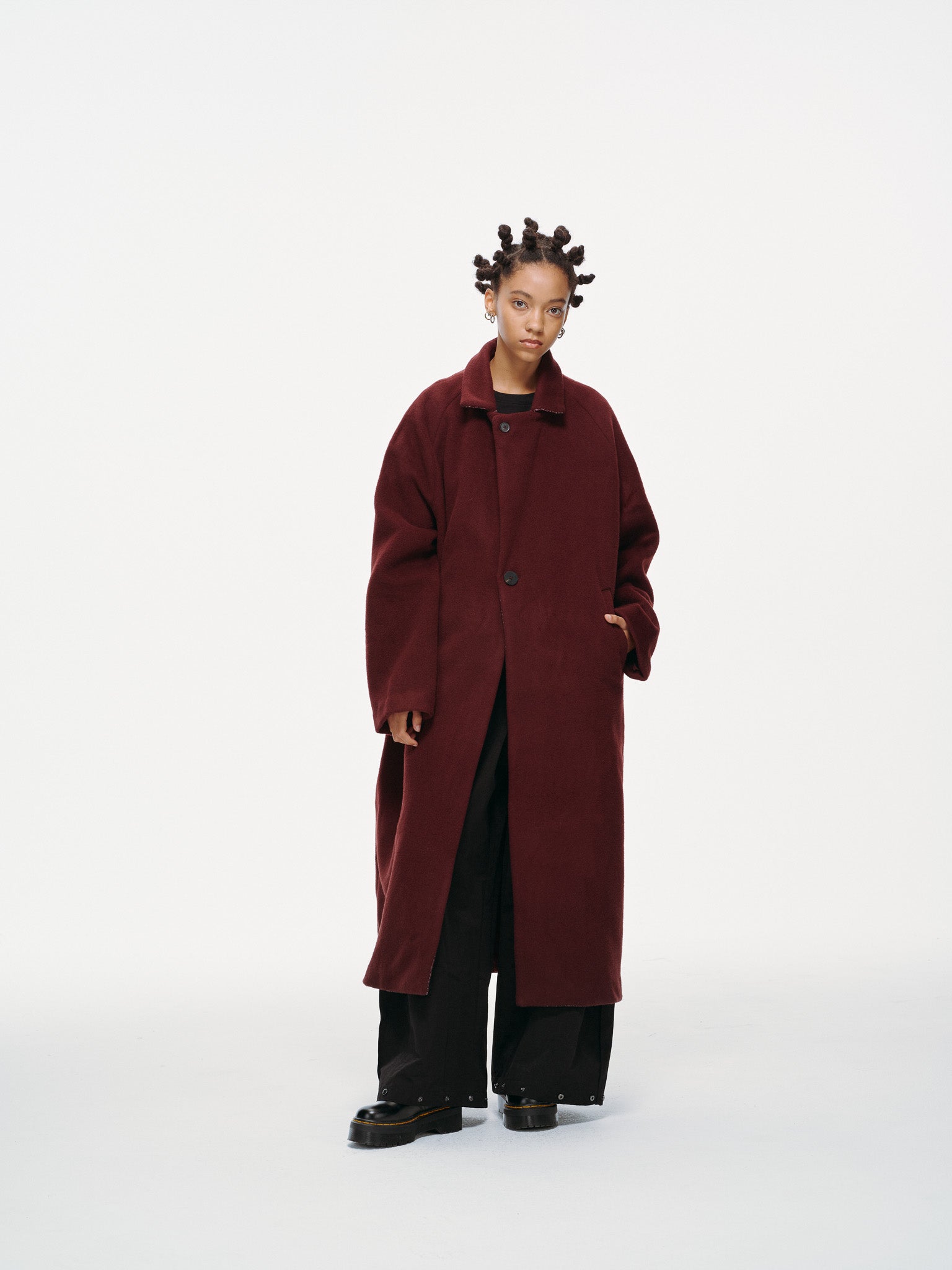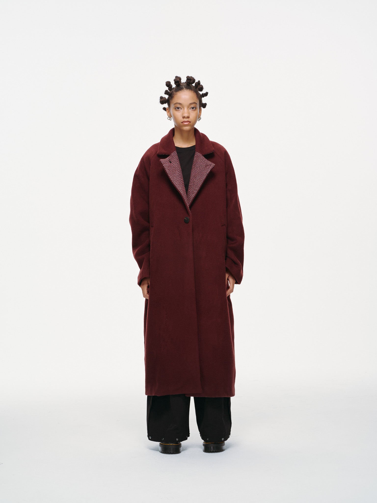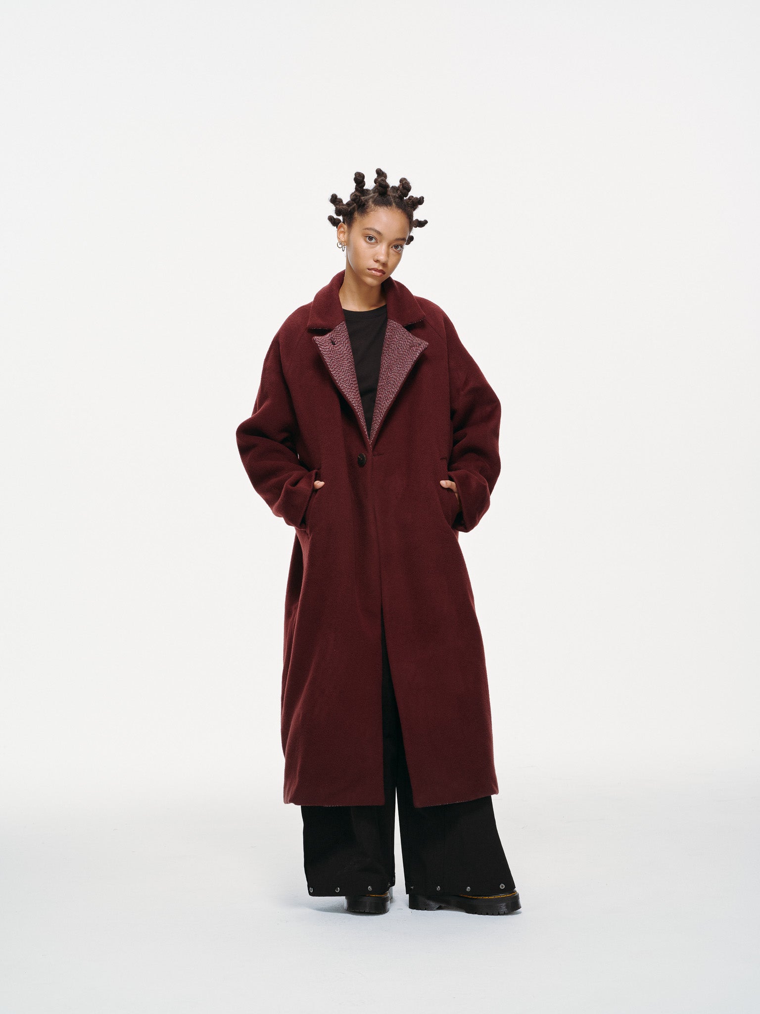 Full-length oversized wool coat in deep burgundy oxblood tone