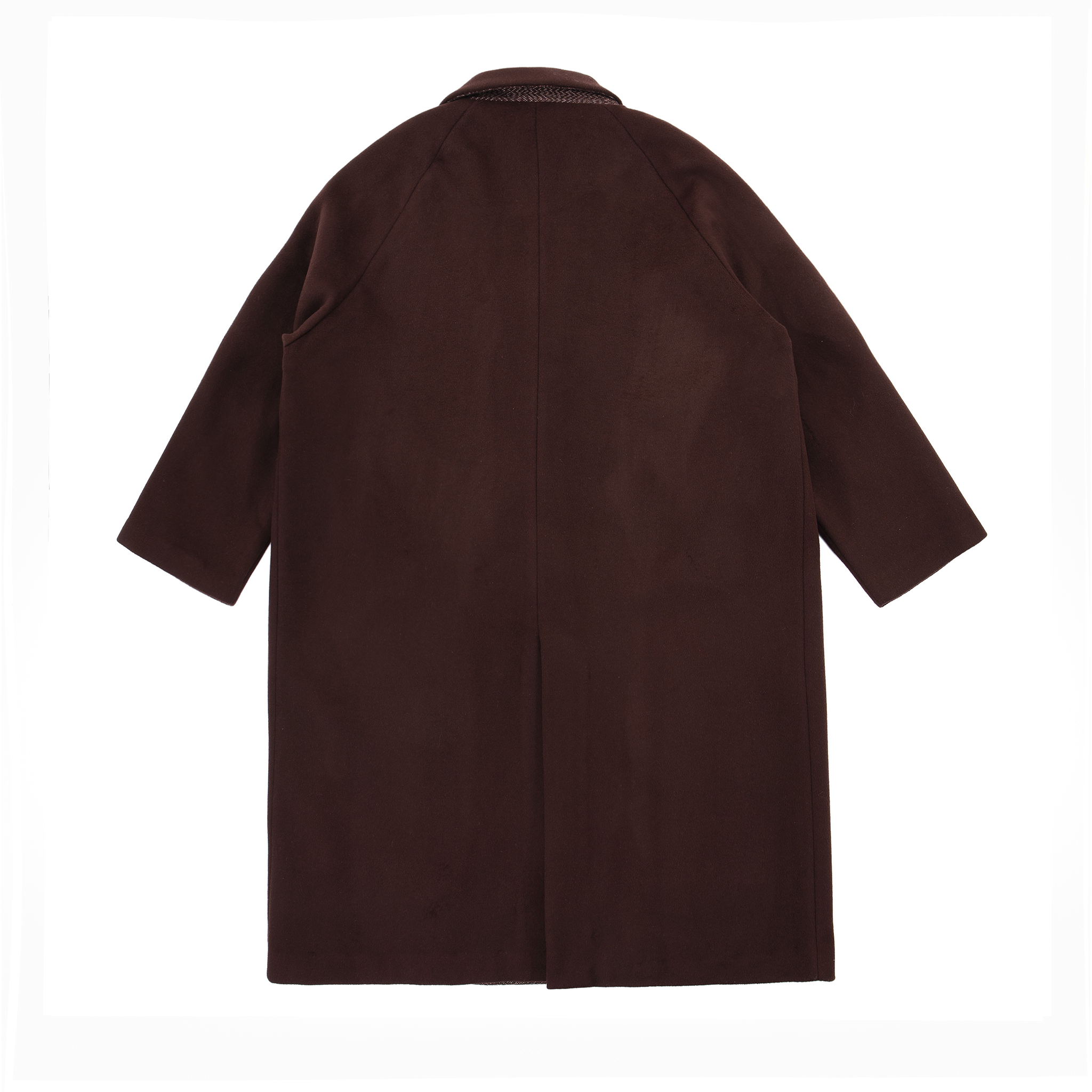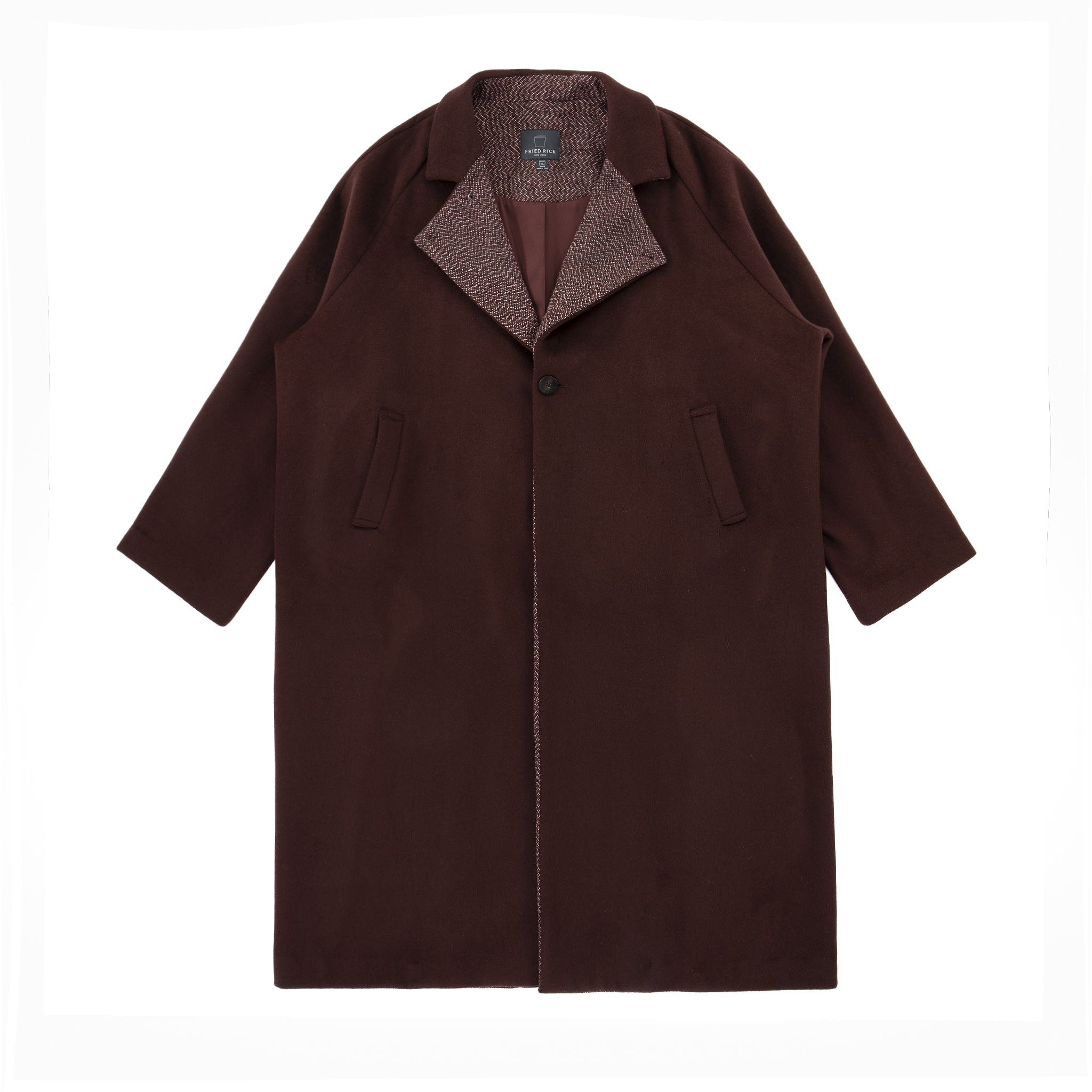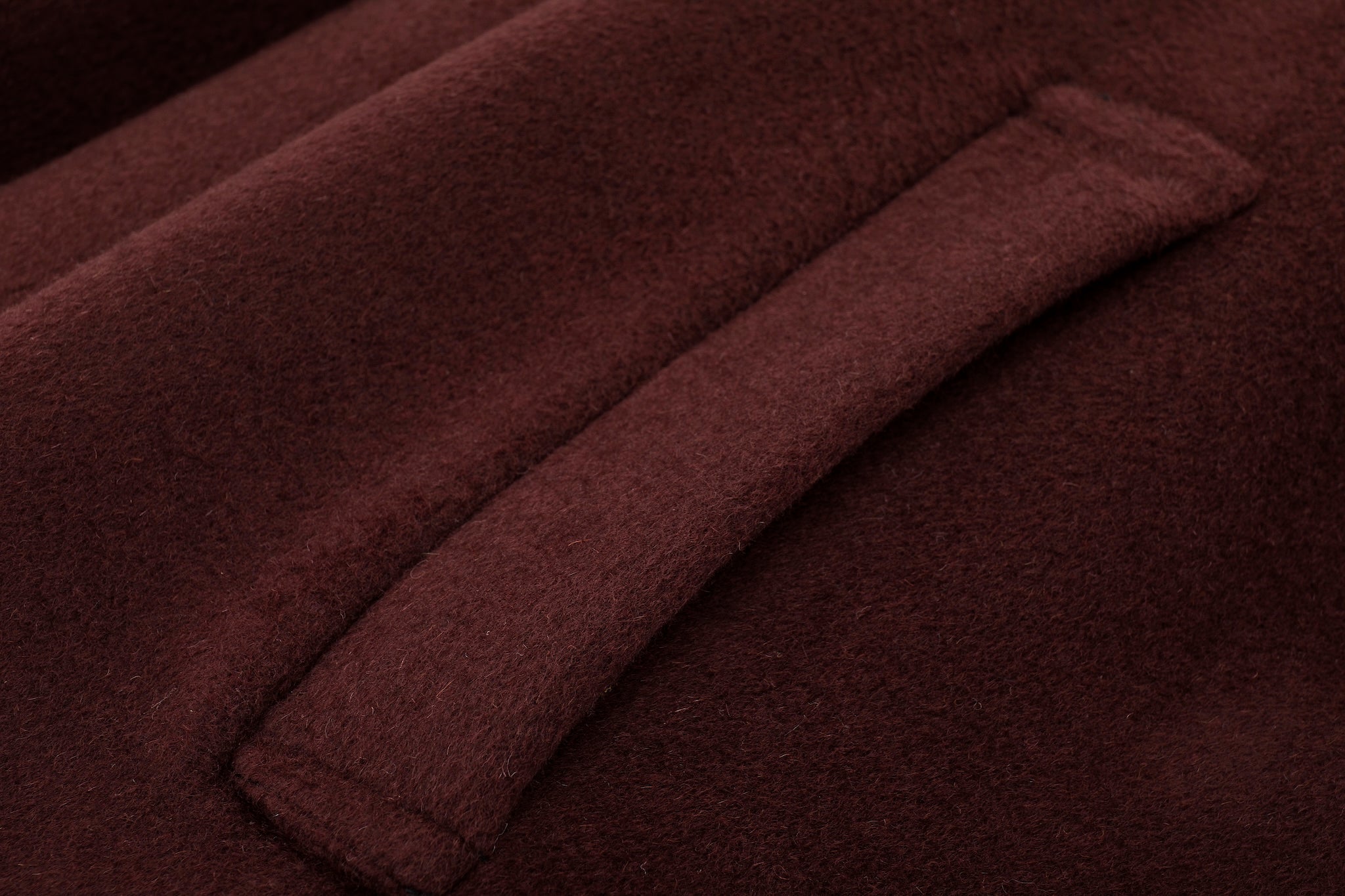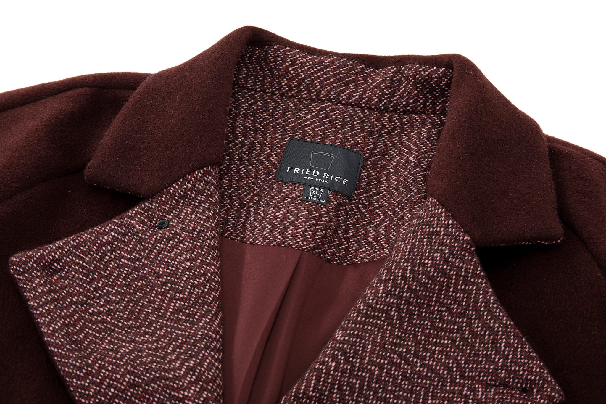 Full-length oversized wool coat in deep burgundy oxblood tone