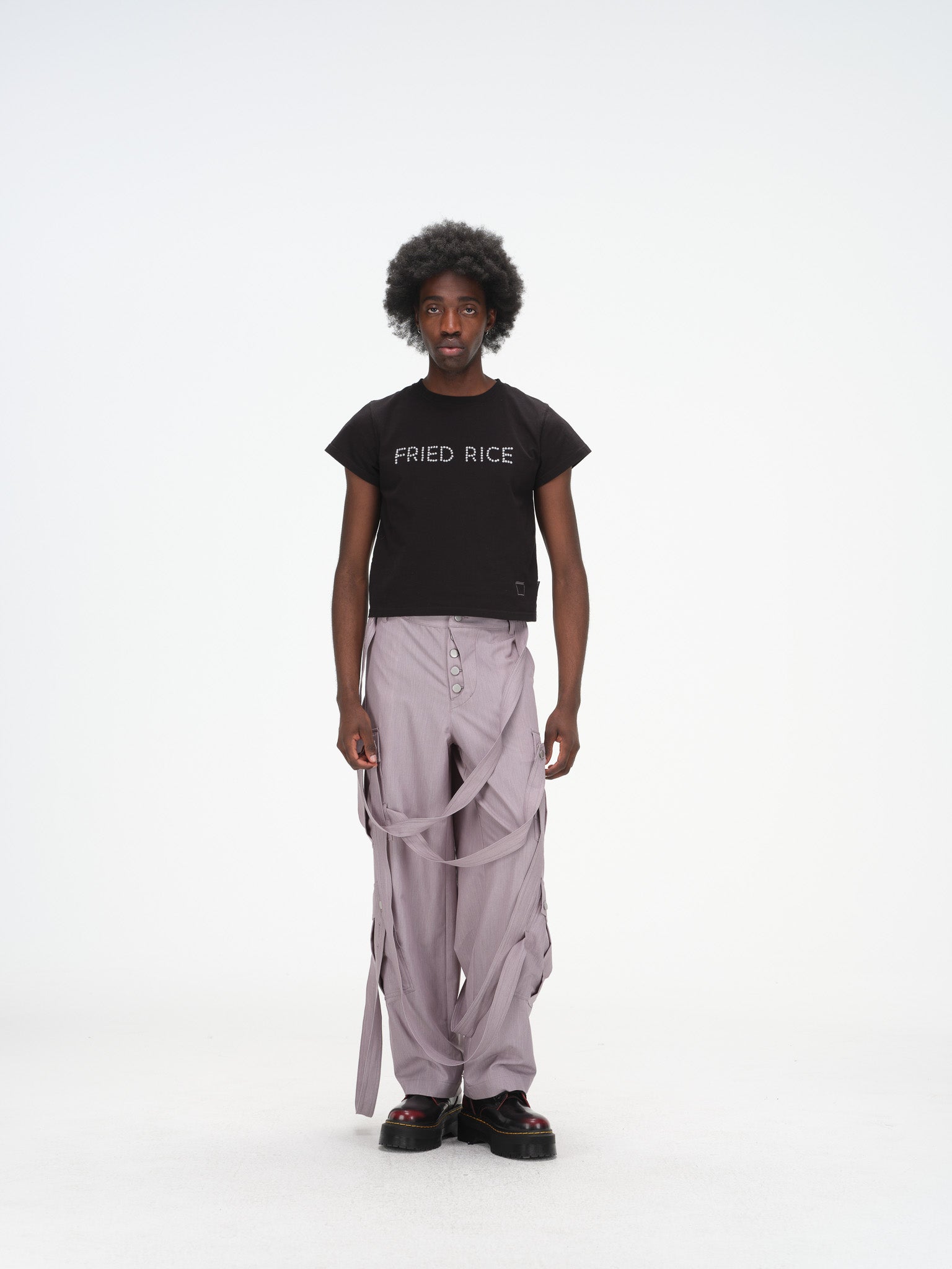 Wide-leg cargo strap pants.