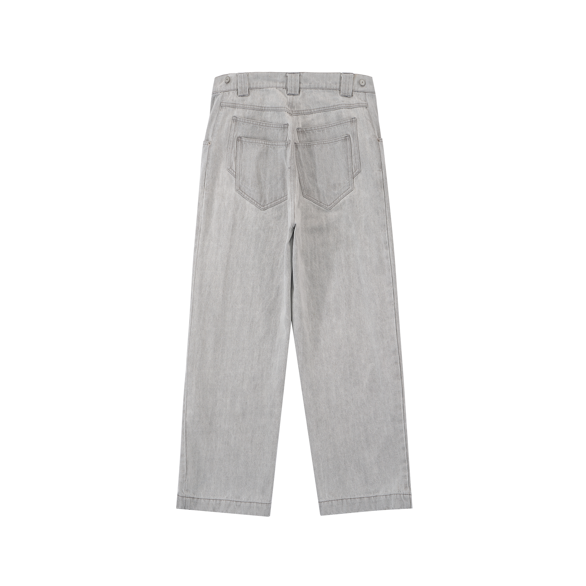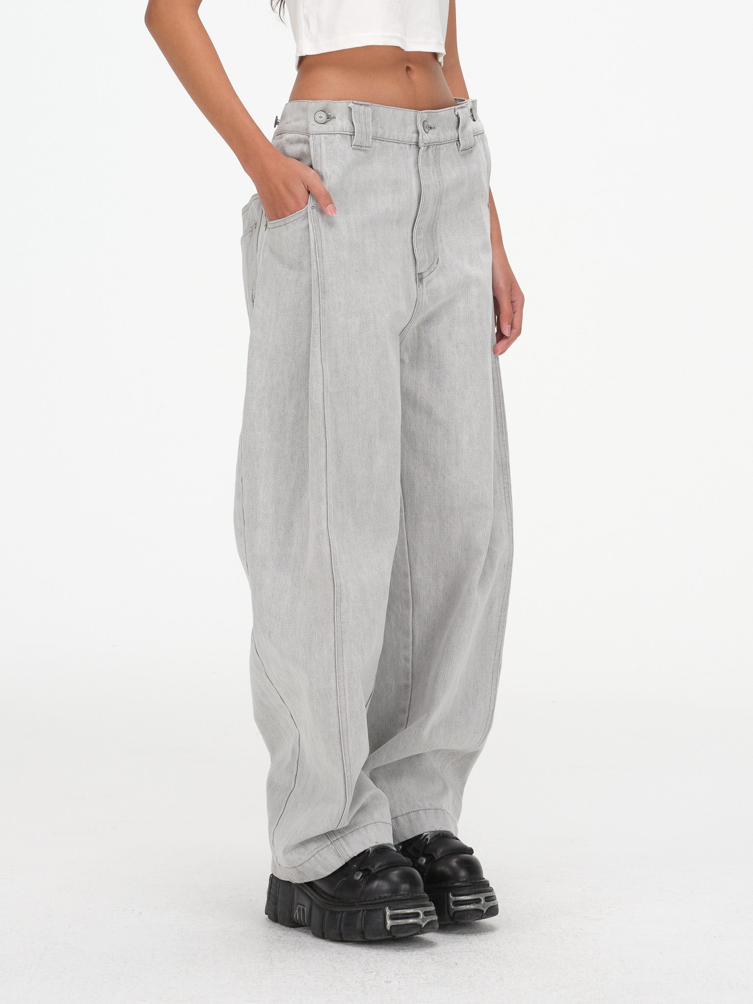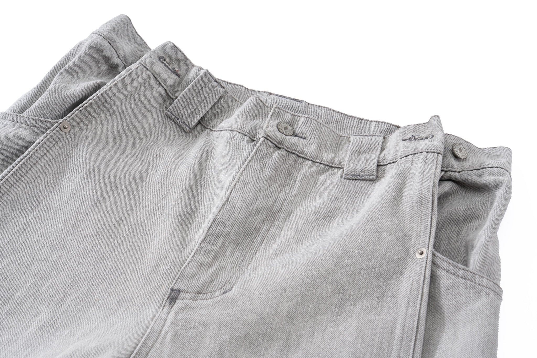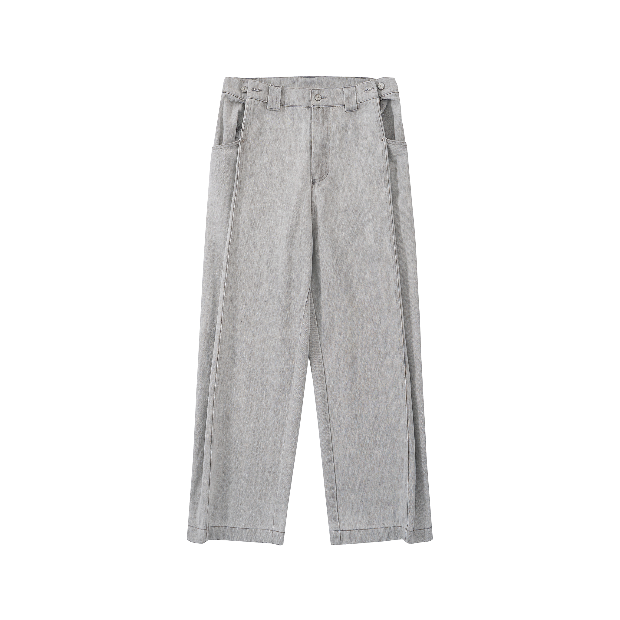 Contoured Wide Leg Denim Pants - Adjustable Button Waist, Washed Grey Denim