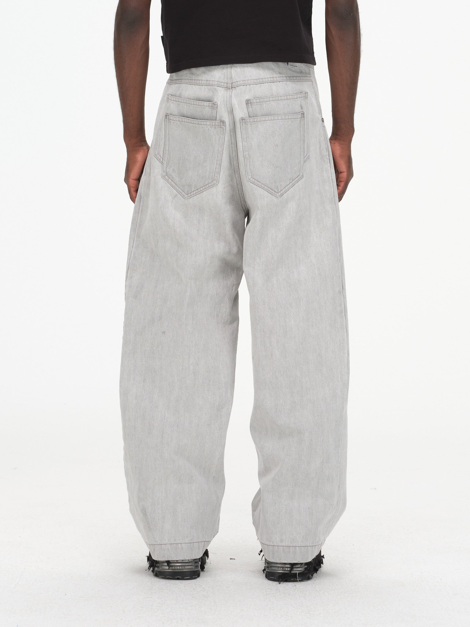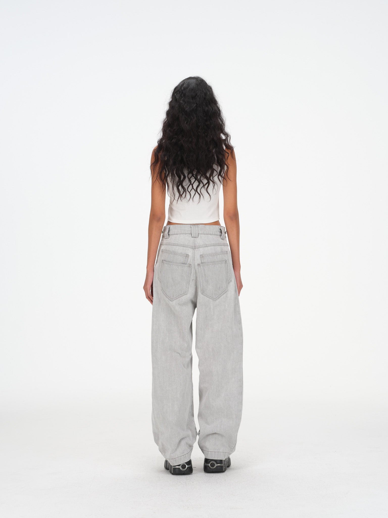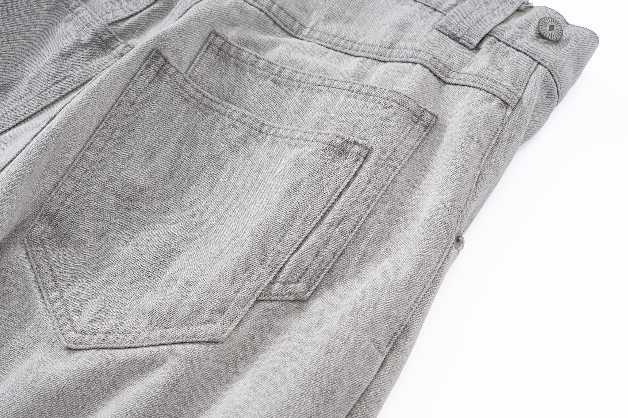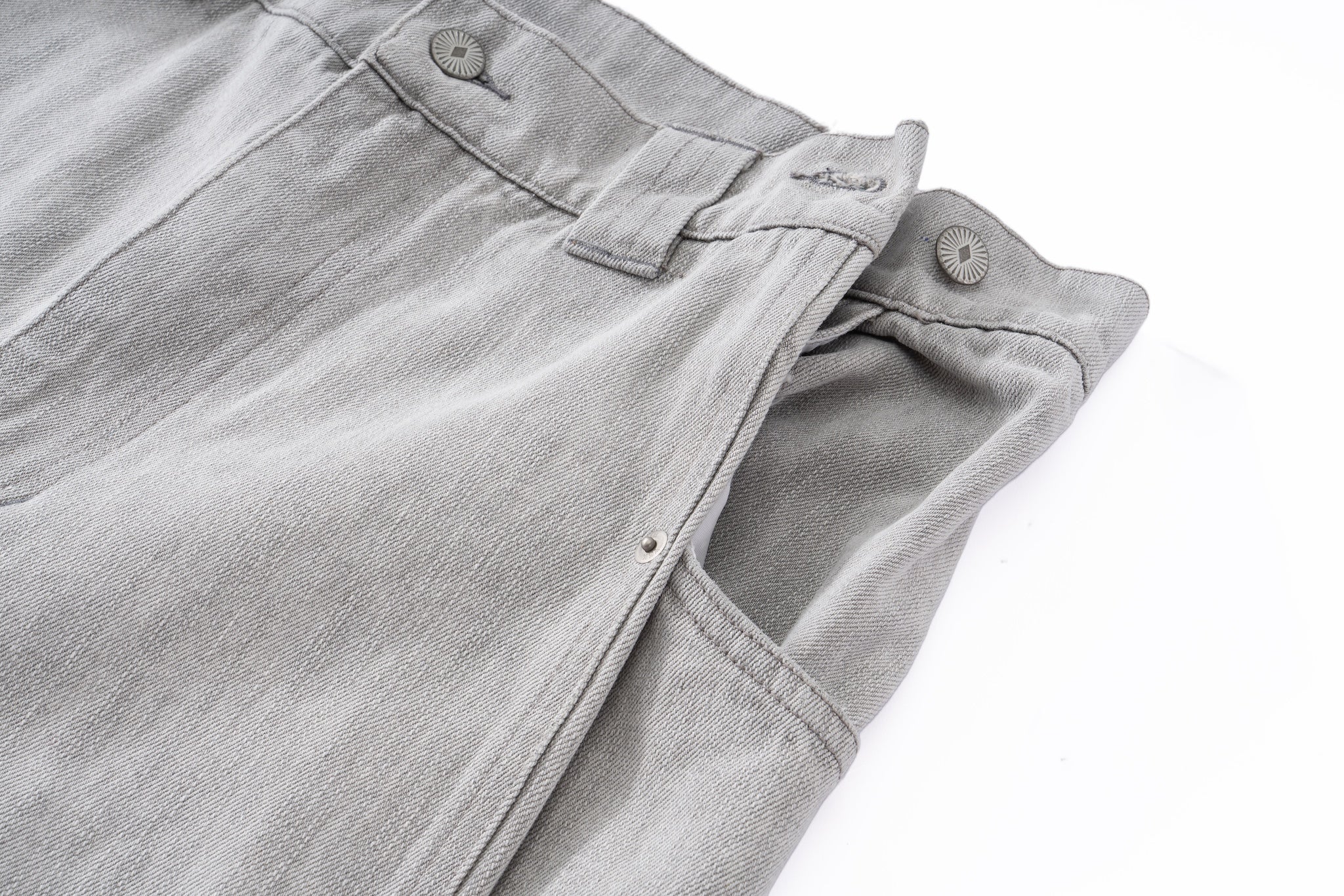 Contoured Wide Leg Denim Pants - Adjustable Button Waist, Washed Grey Denim
