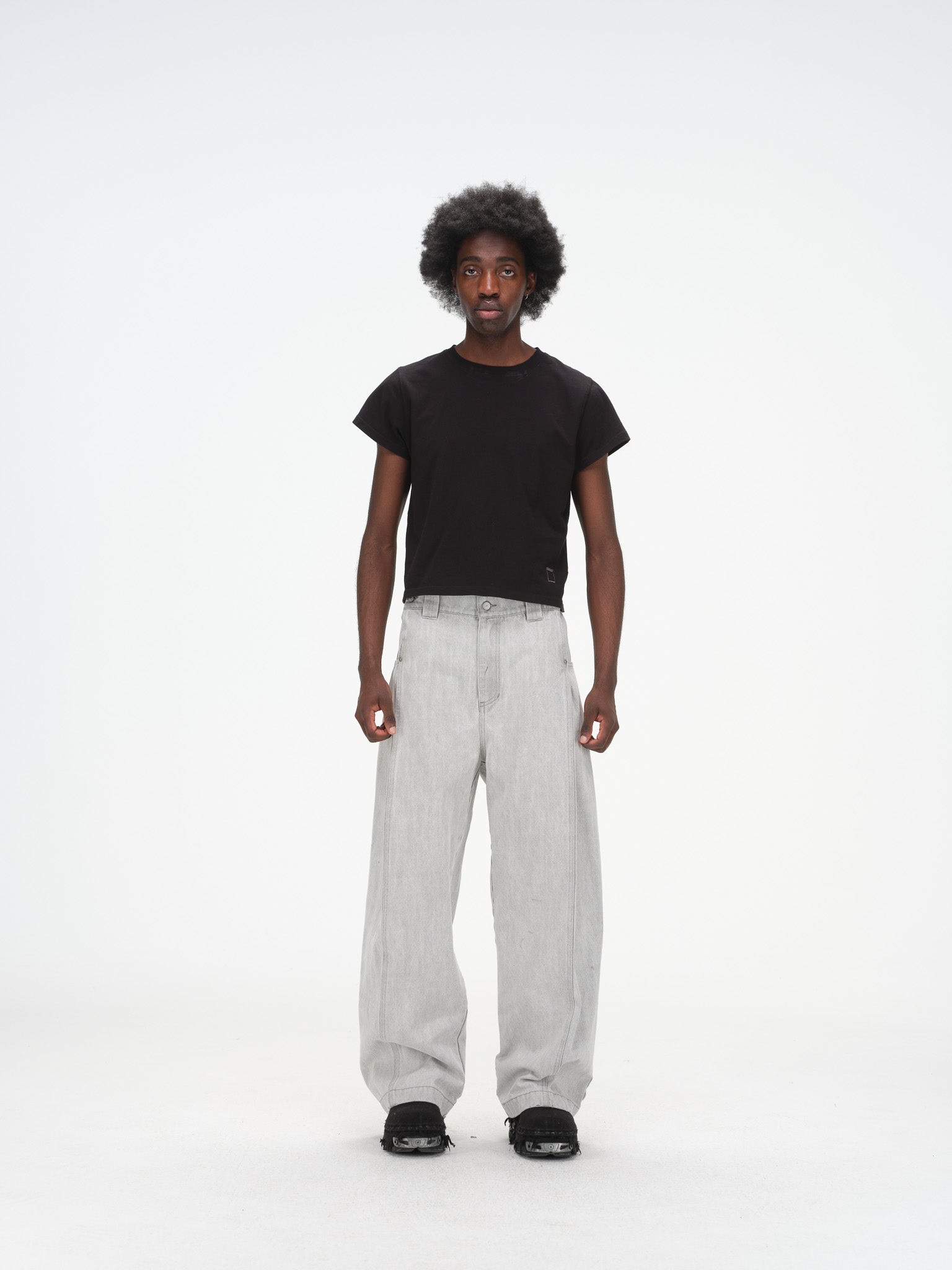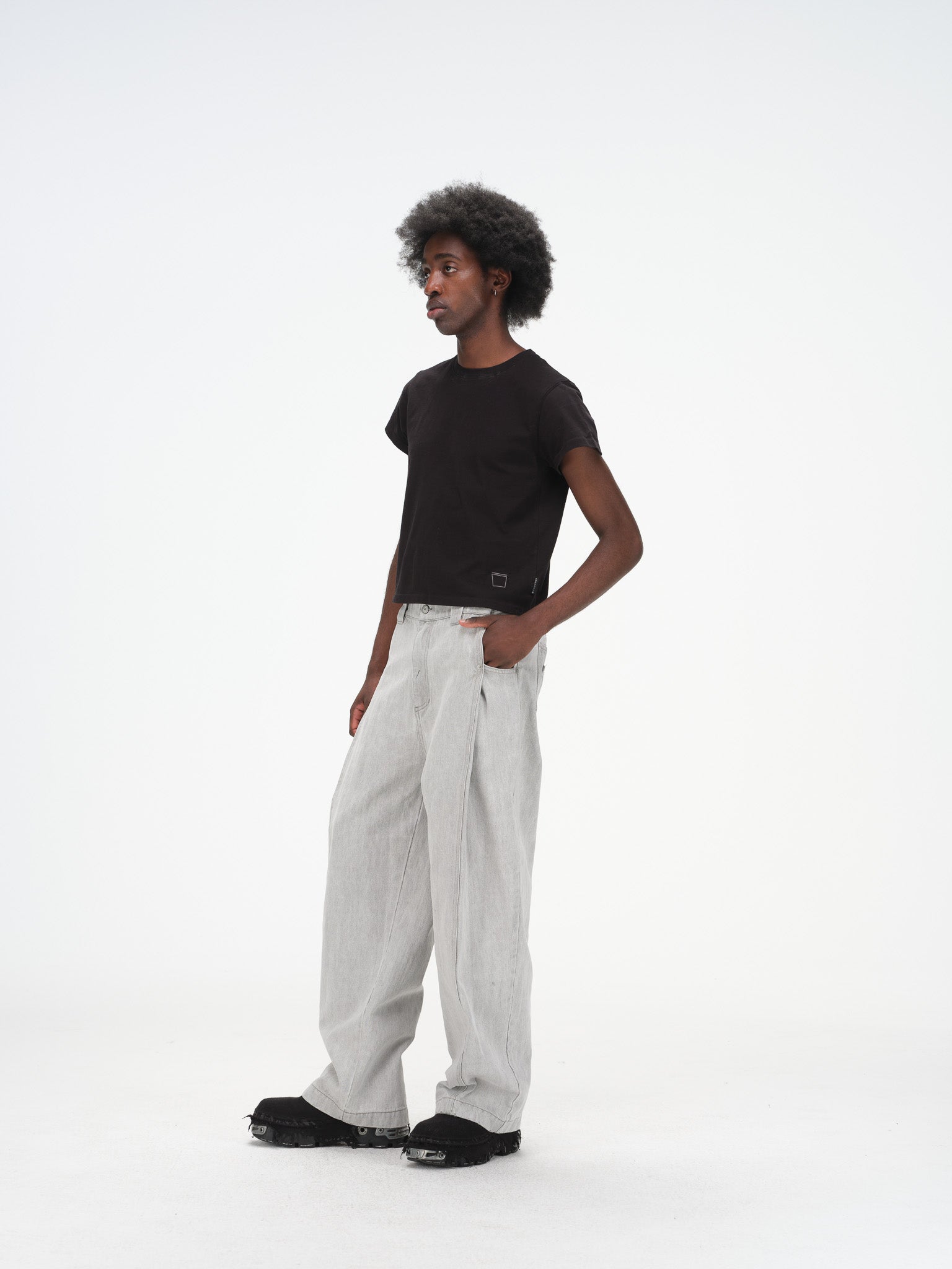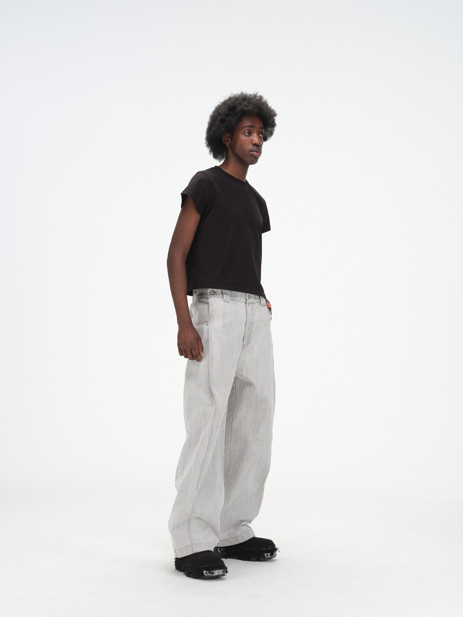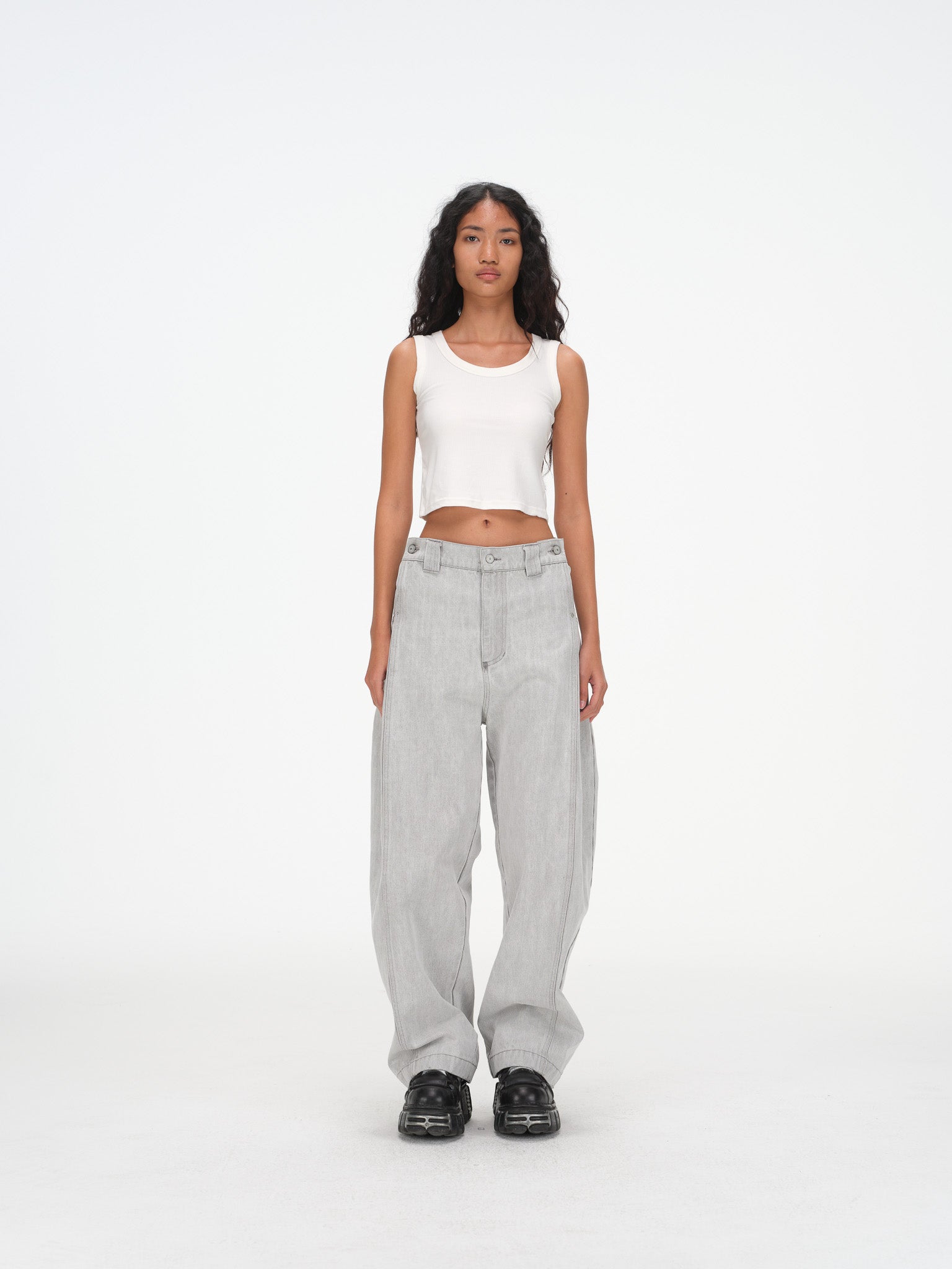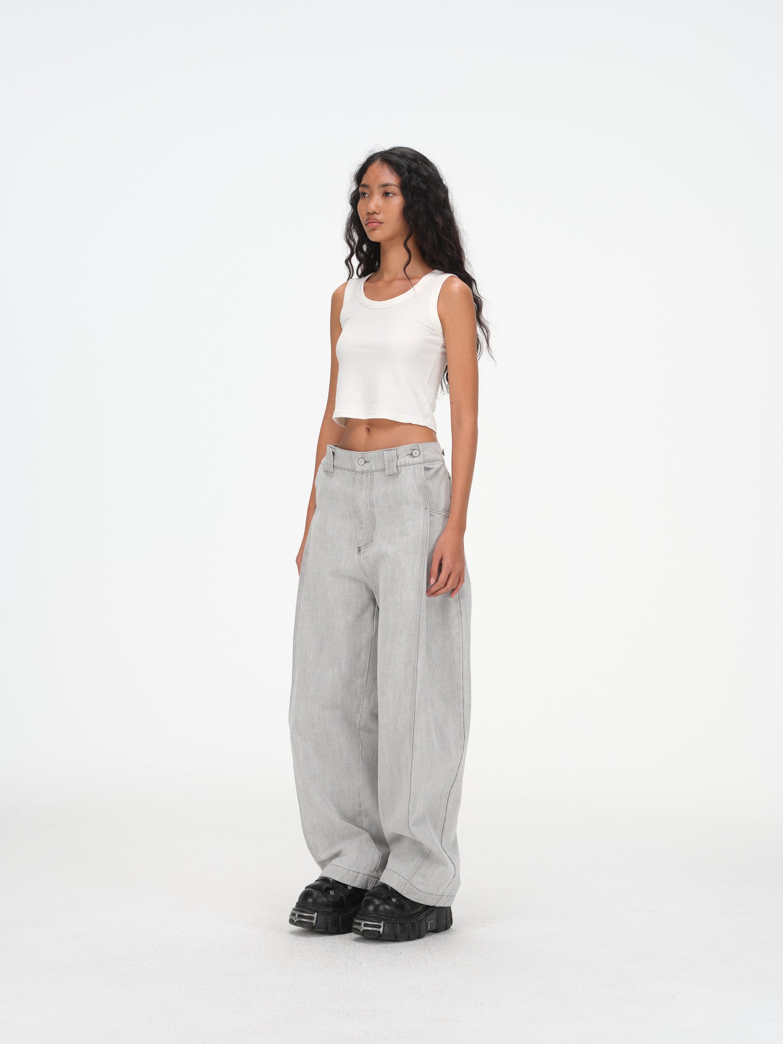 Relaxed wide-leg (subtle barrel leg) silhouette with a tailored mid-rise waist