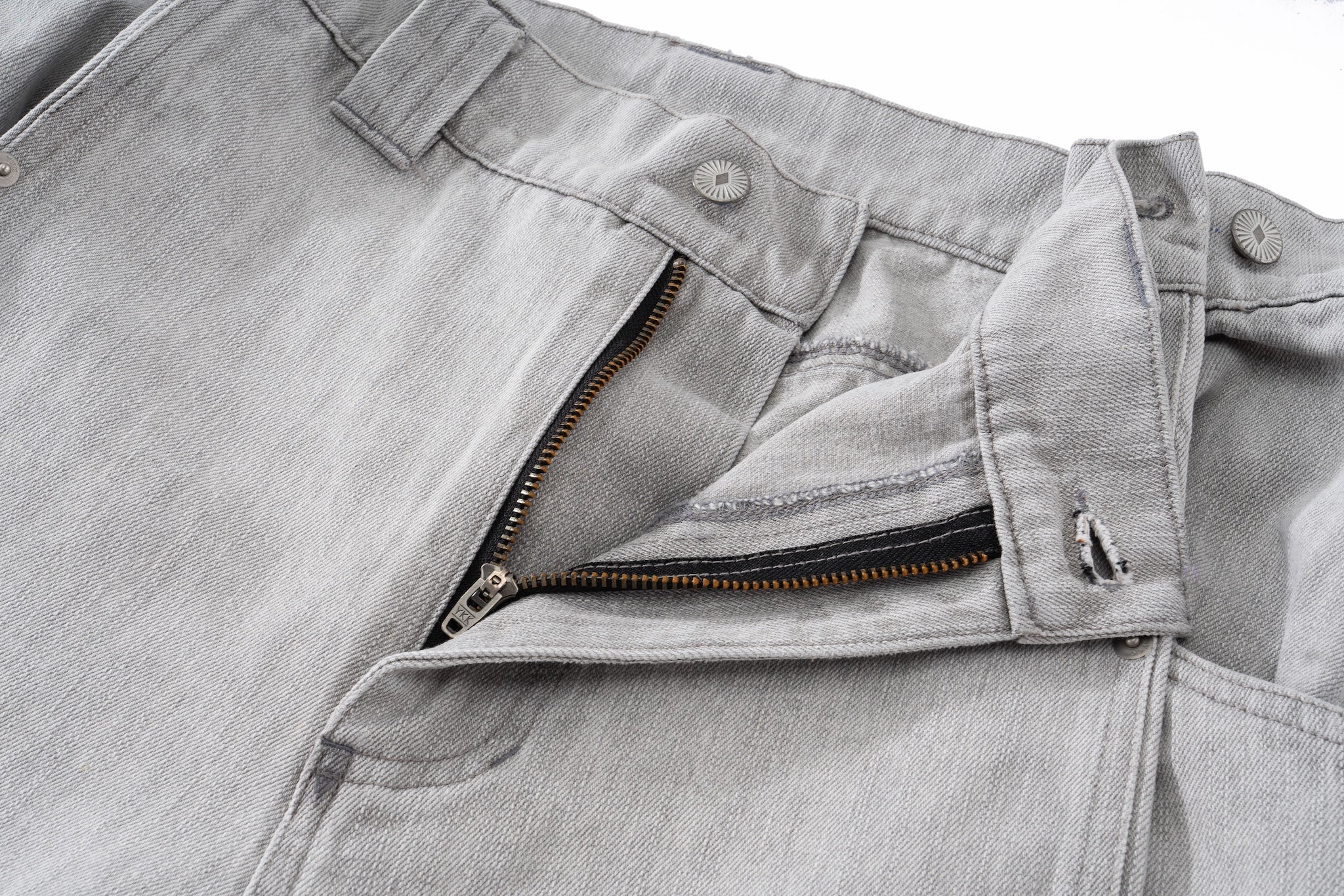 Belt loops, button closure, and reinforced stitching throughout