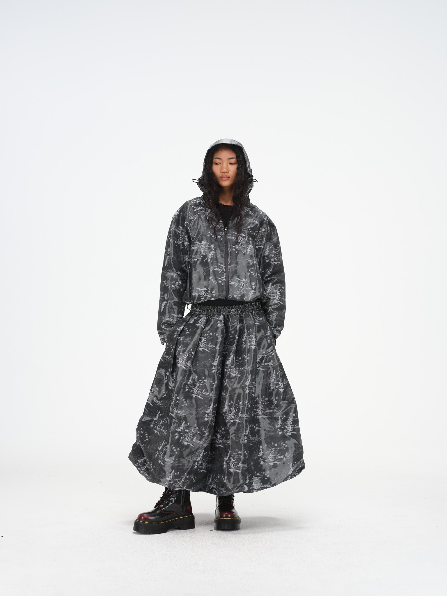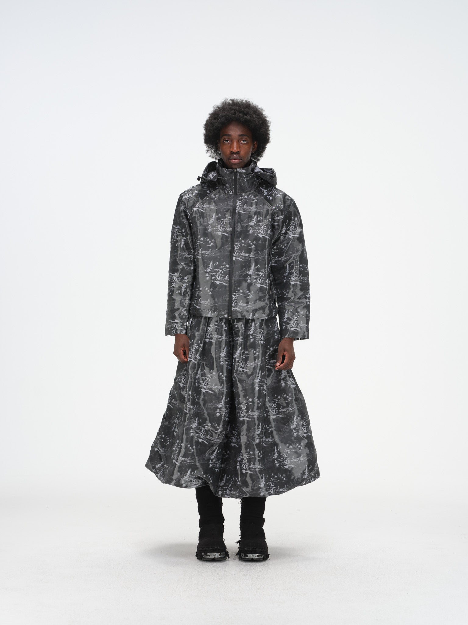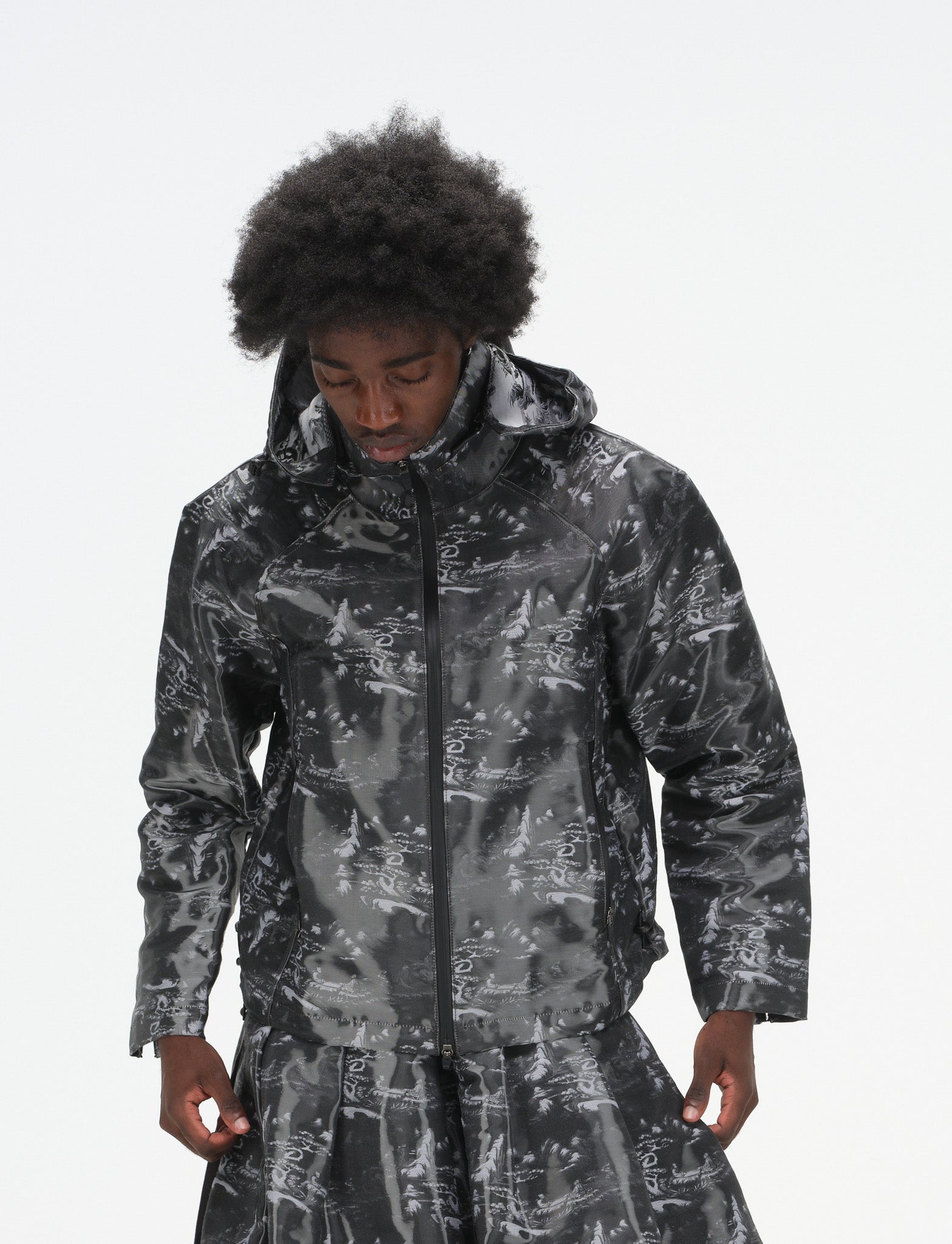 Technical hooded jacket with tonal ink wash print