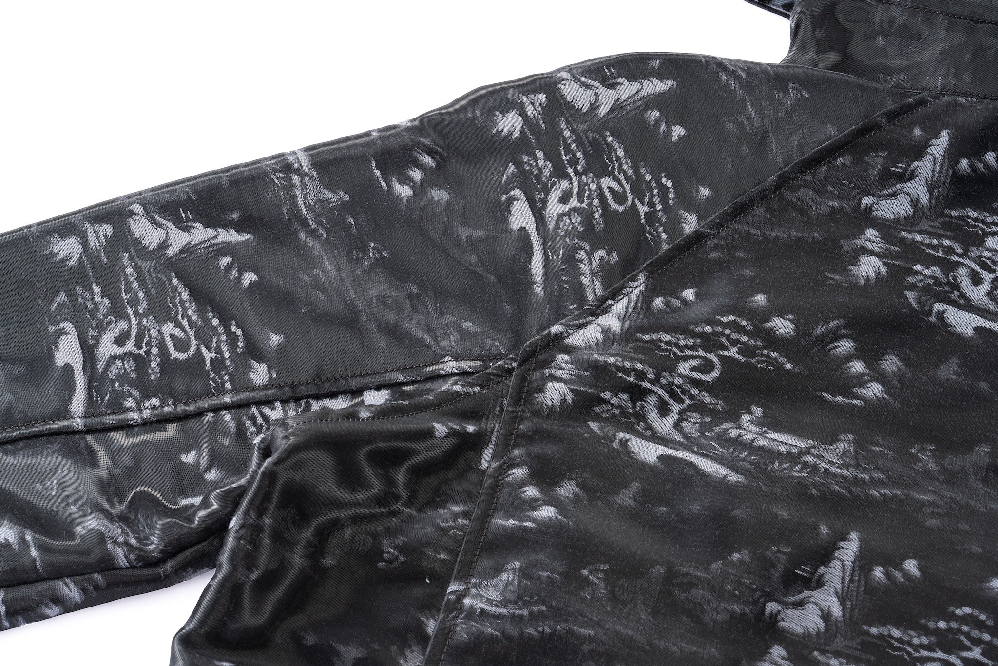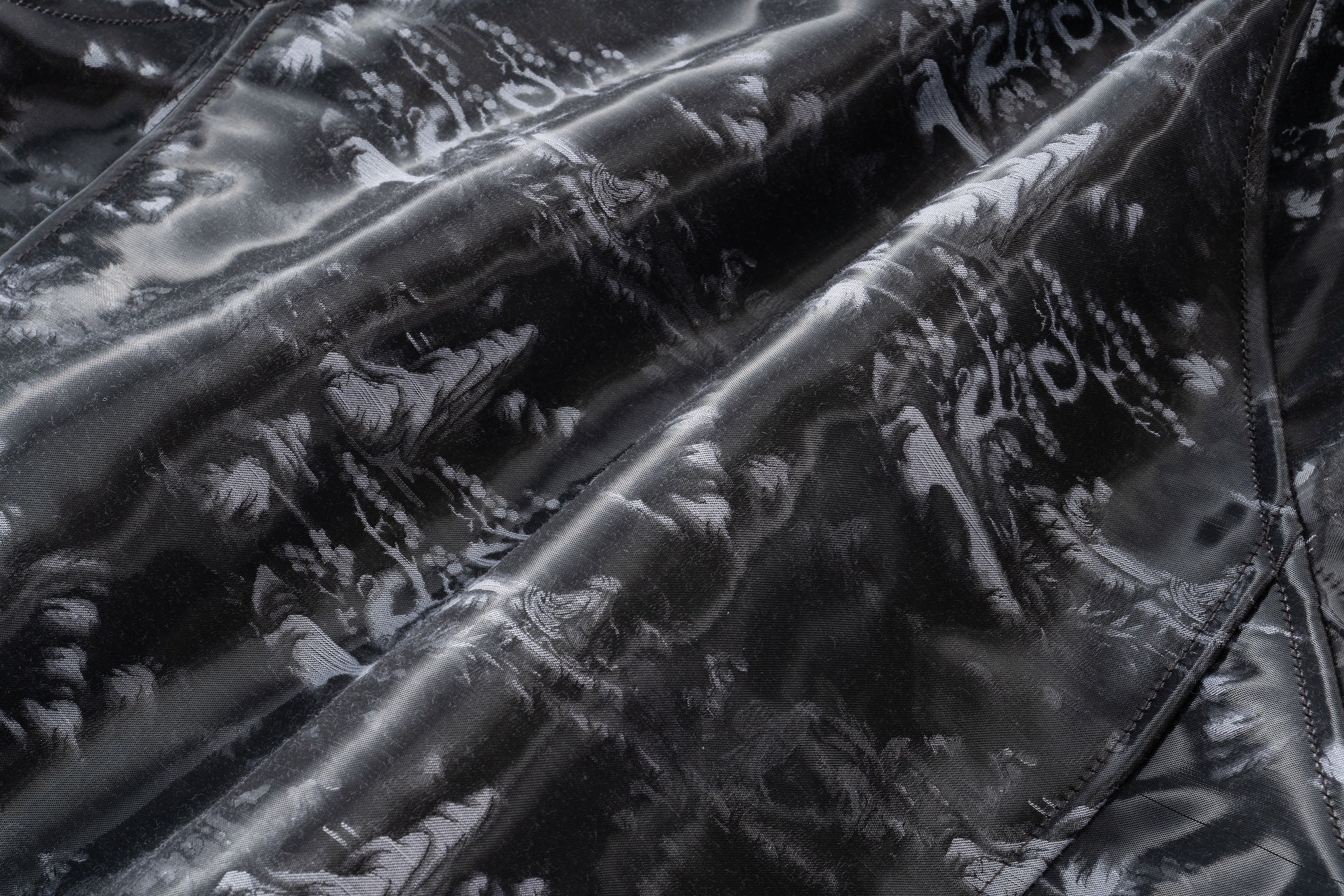 Deep charcoal and black tones on glossy technical fabric mimic shadow and light