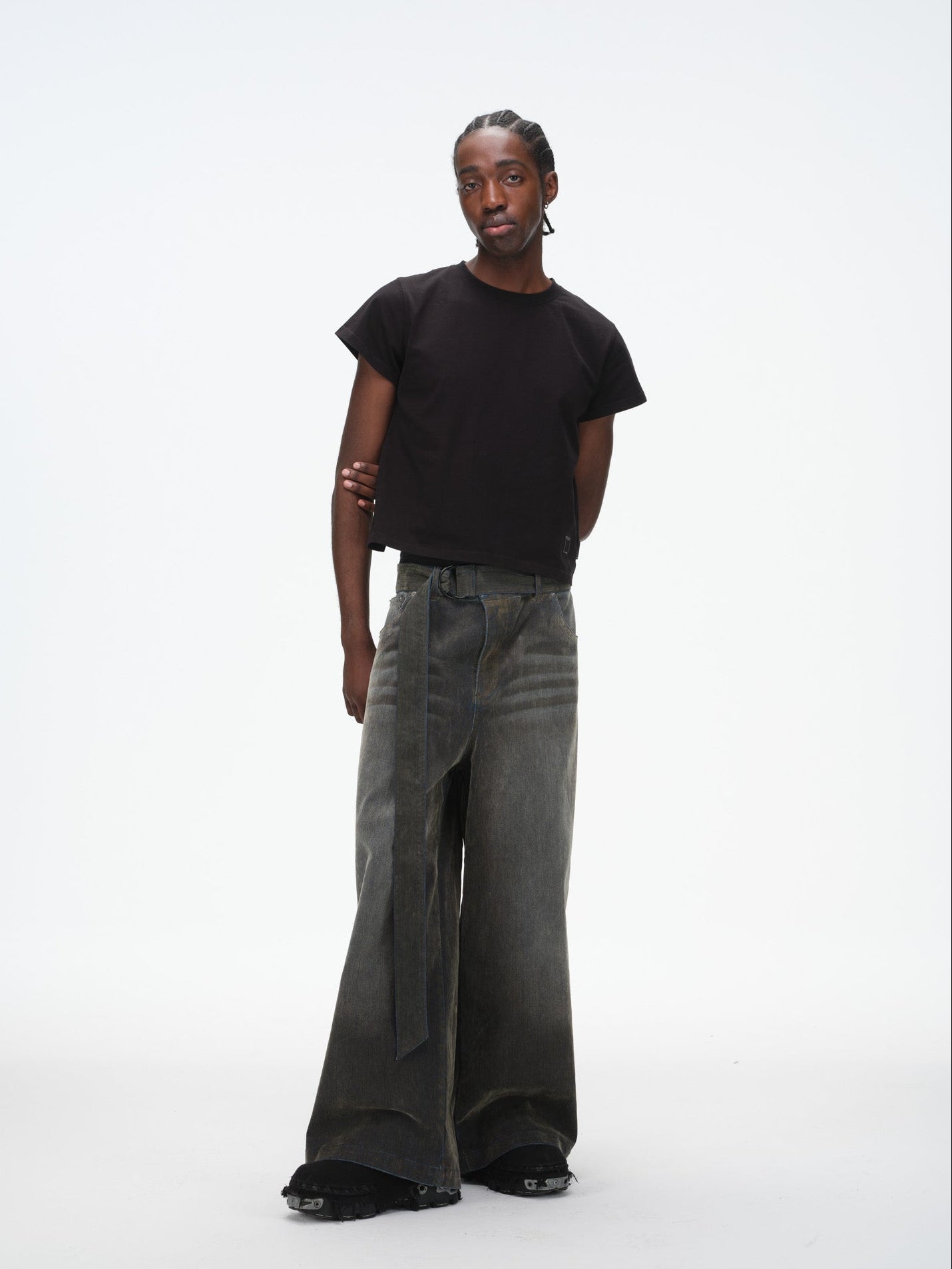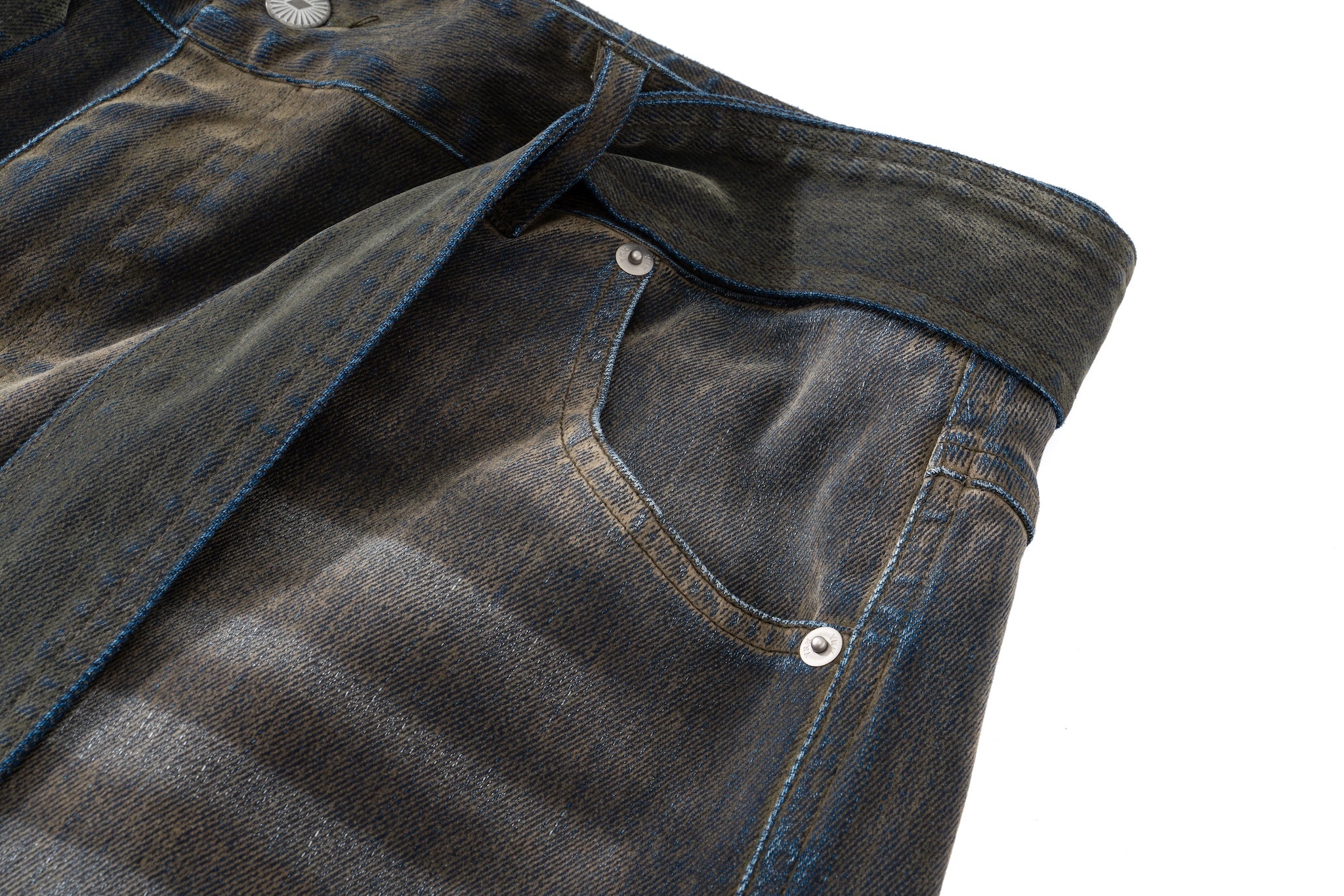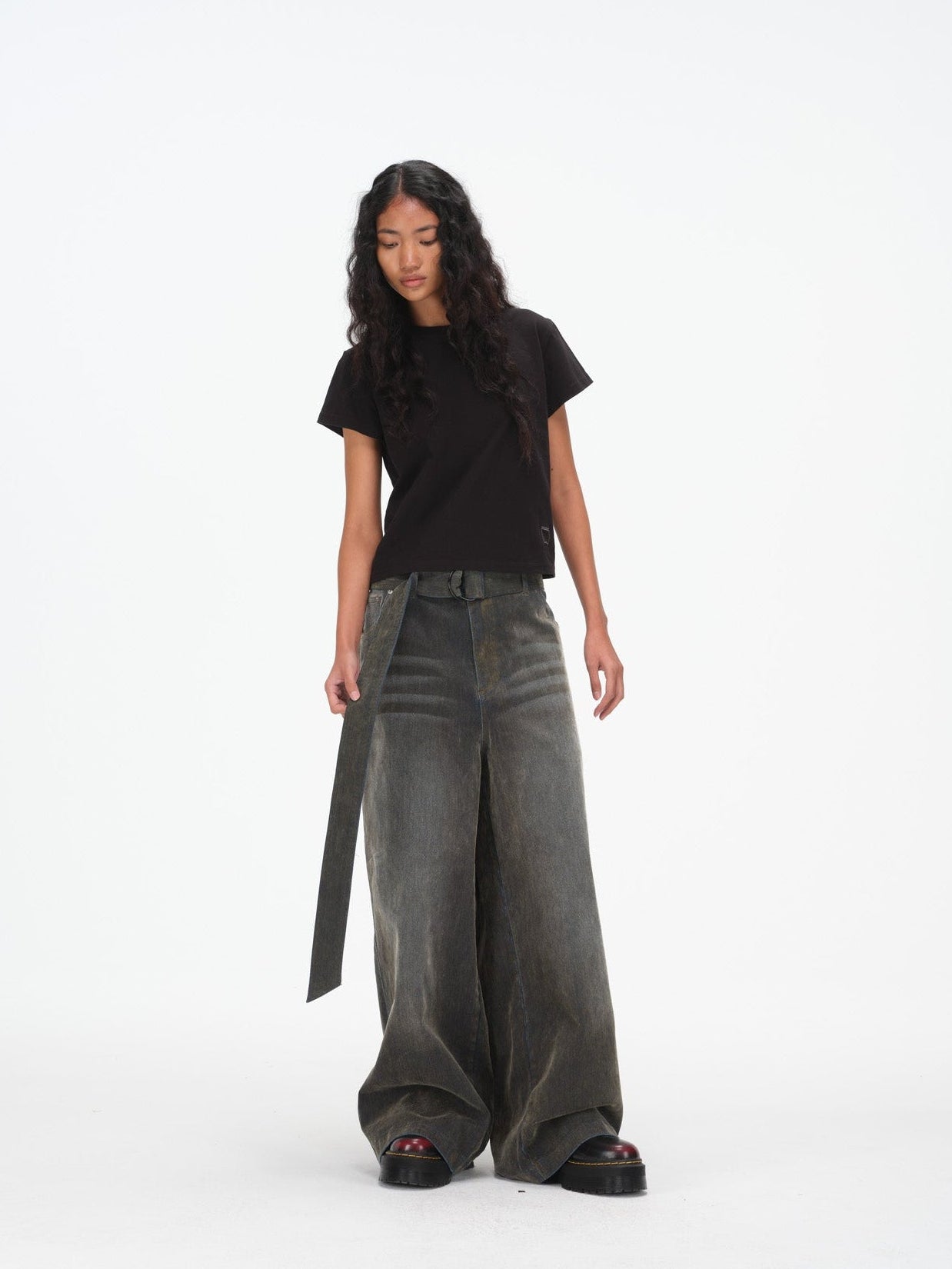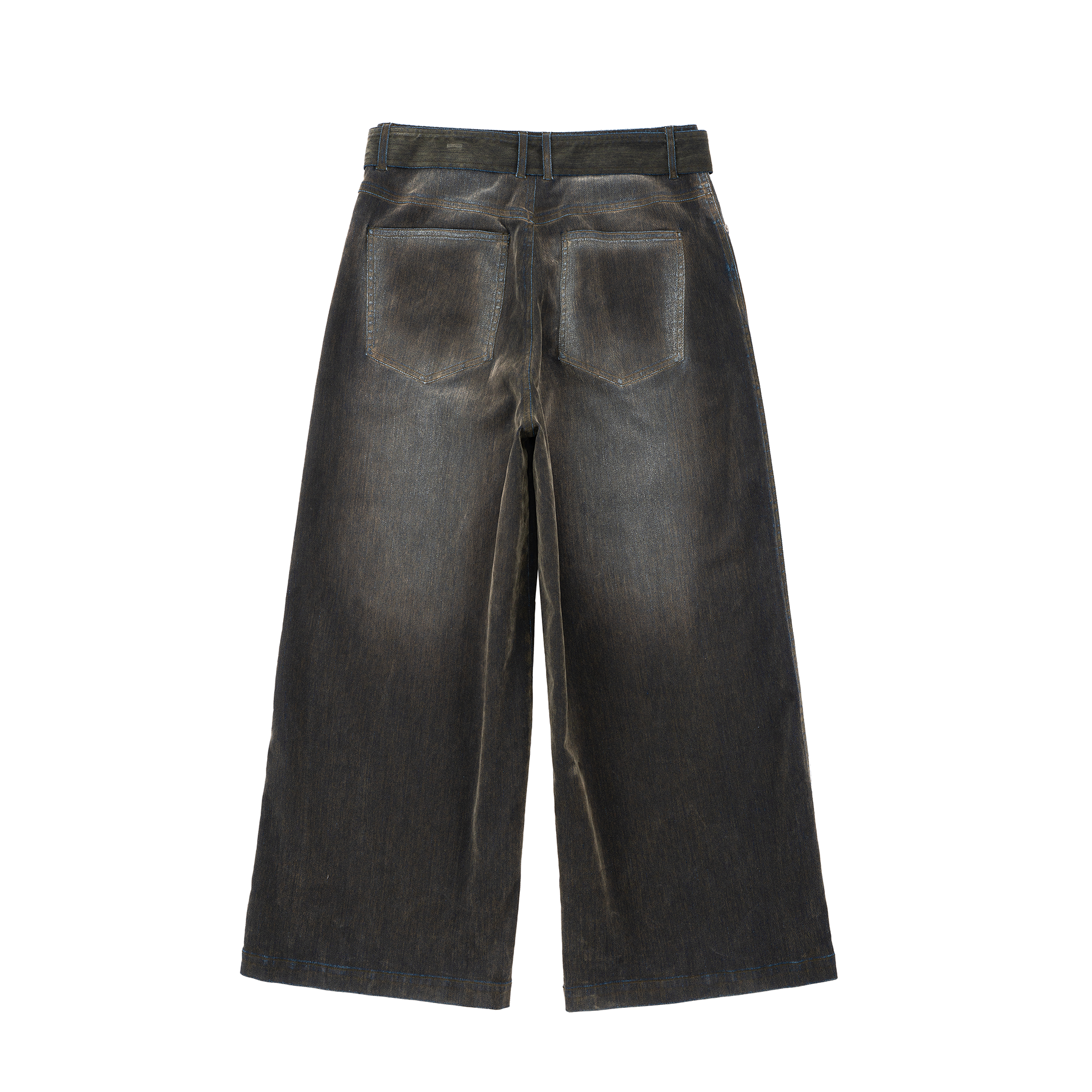 Iridescent Wide Leg Denim Pants with Sash Belt- Charcoal Wash