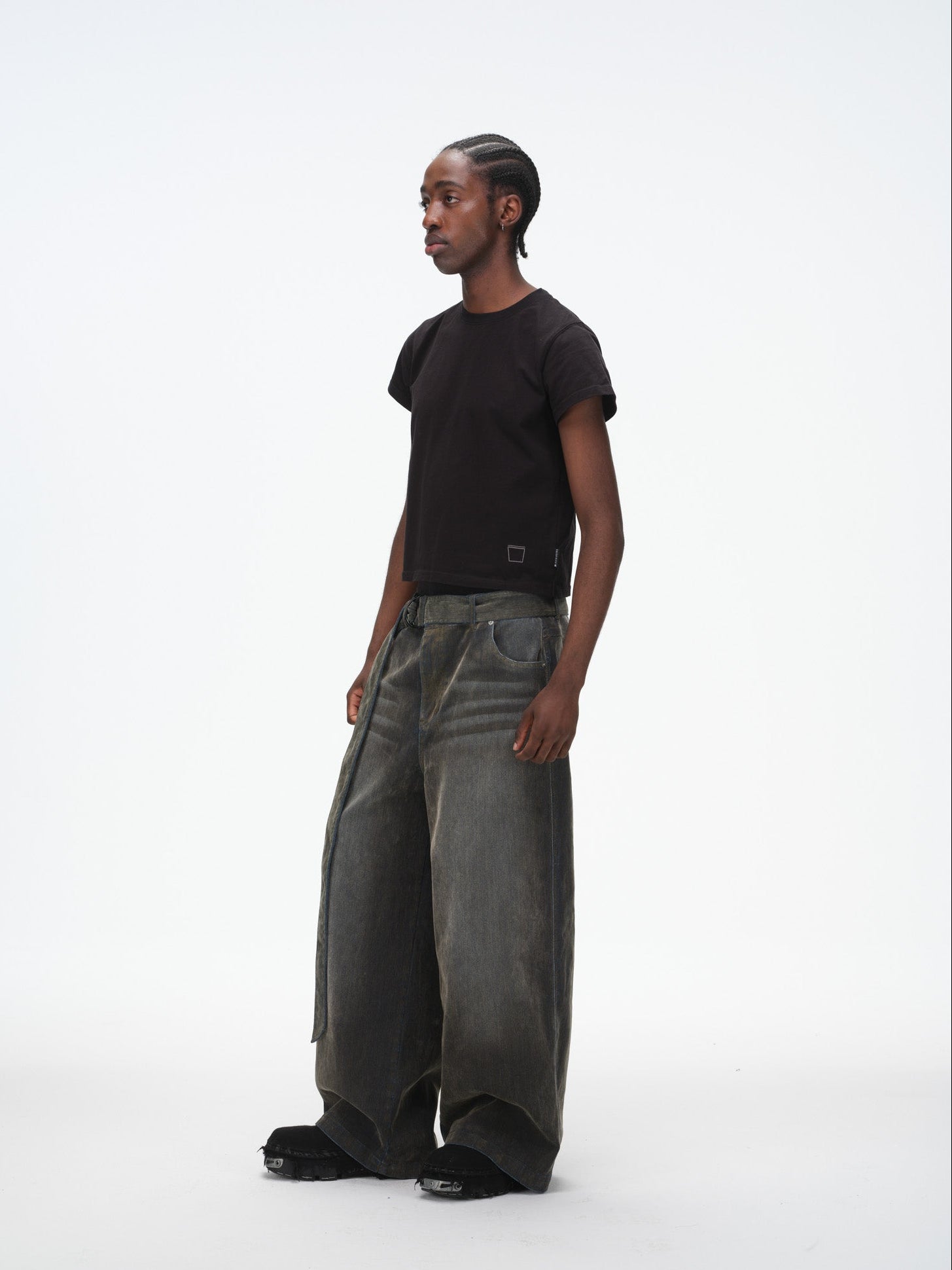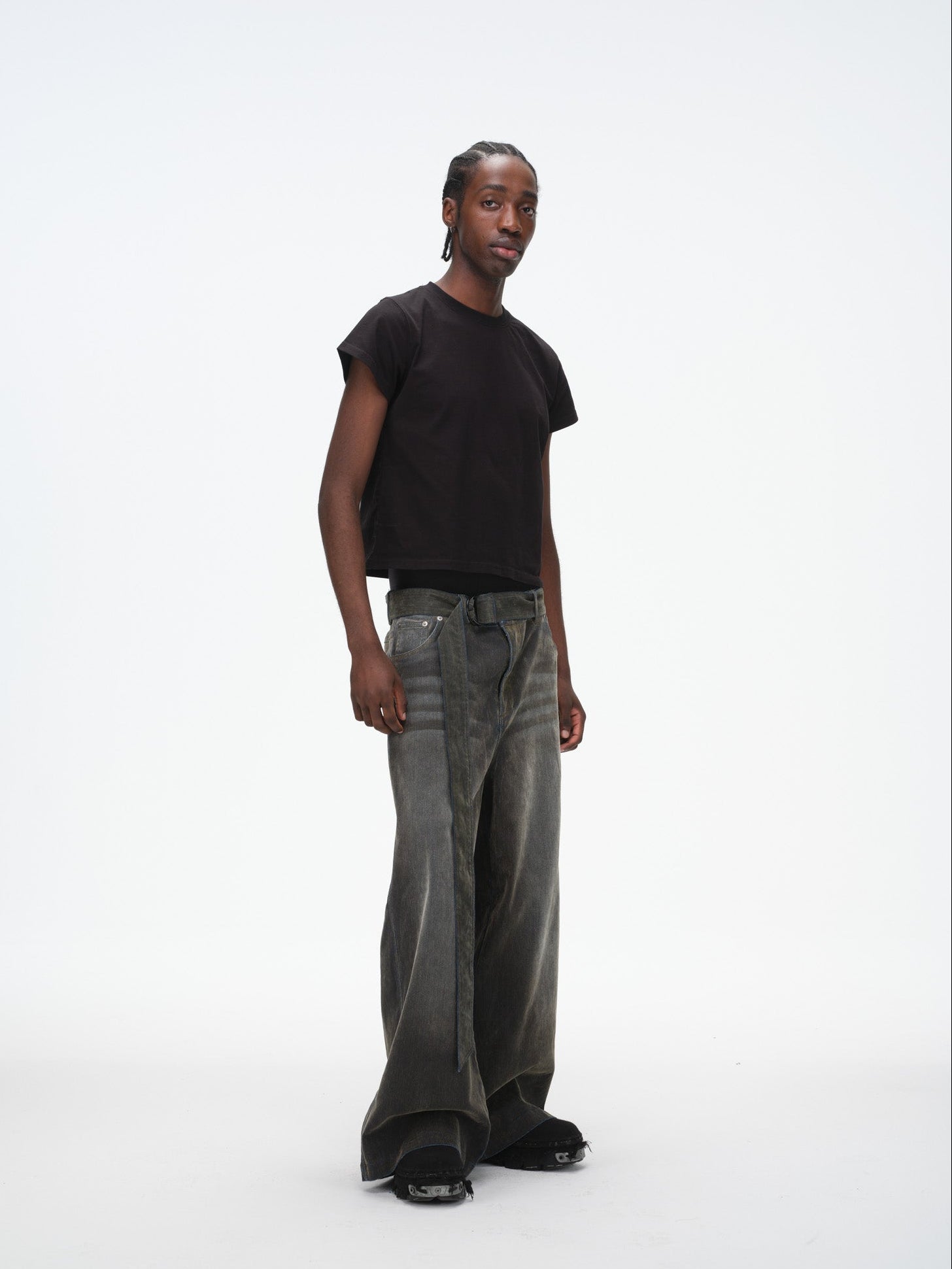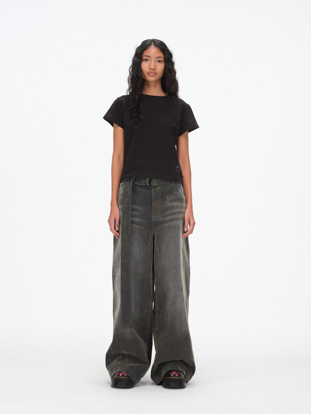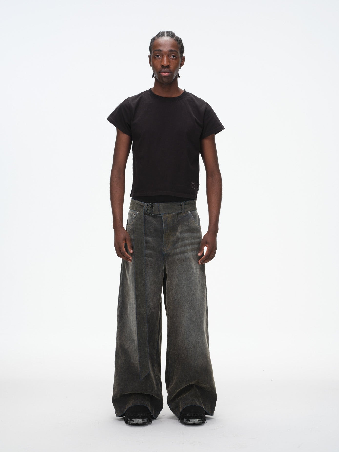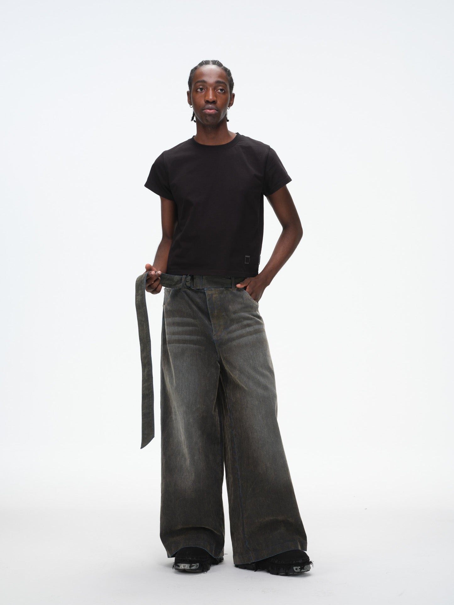 Iridescent Wide Leg Denim Pants with Sash Belt- Charcoal Wash