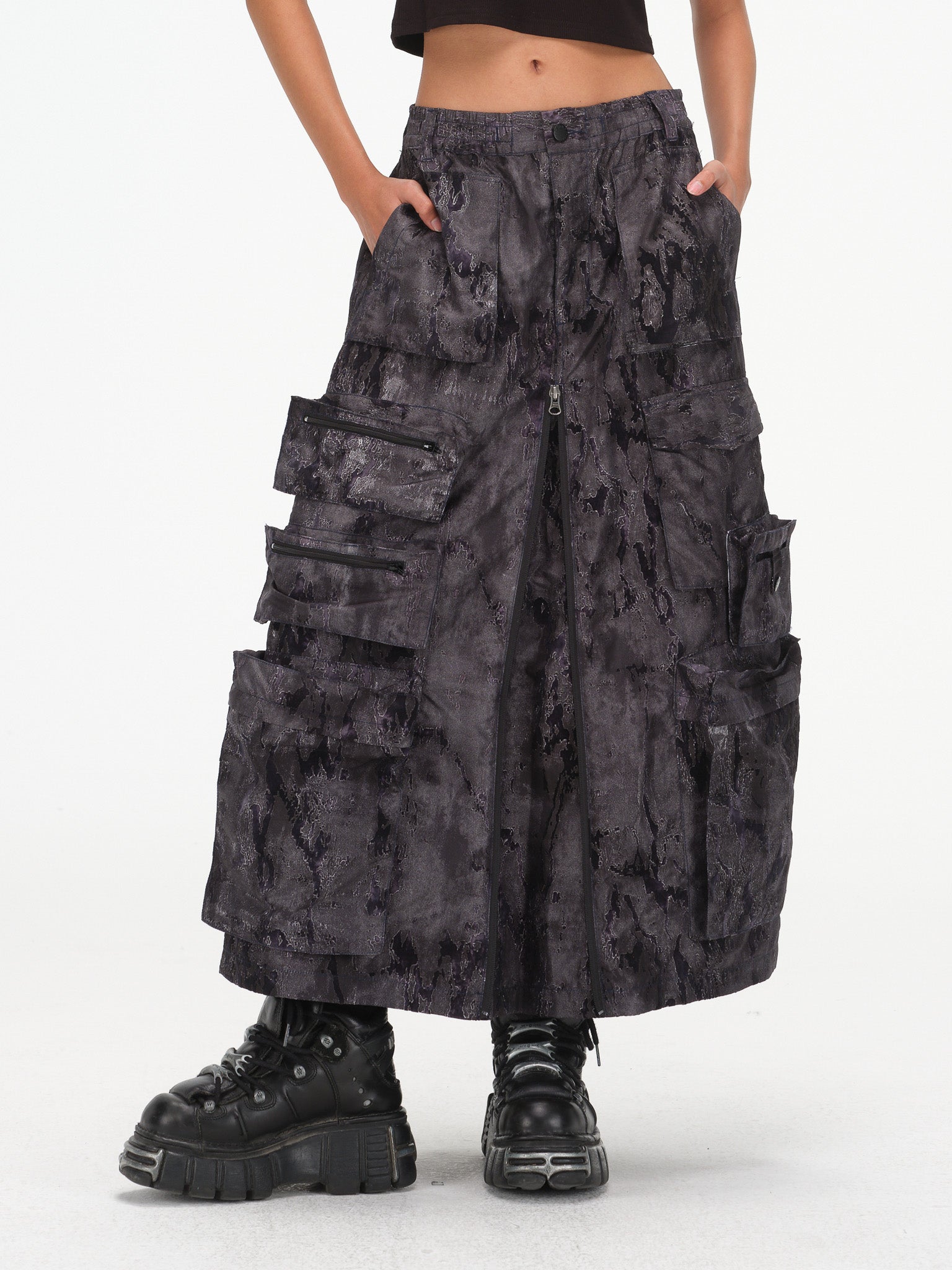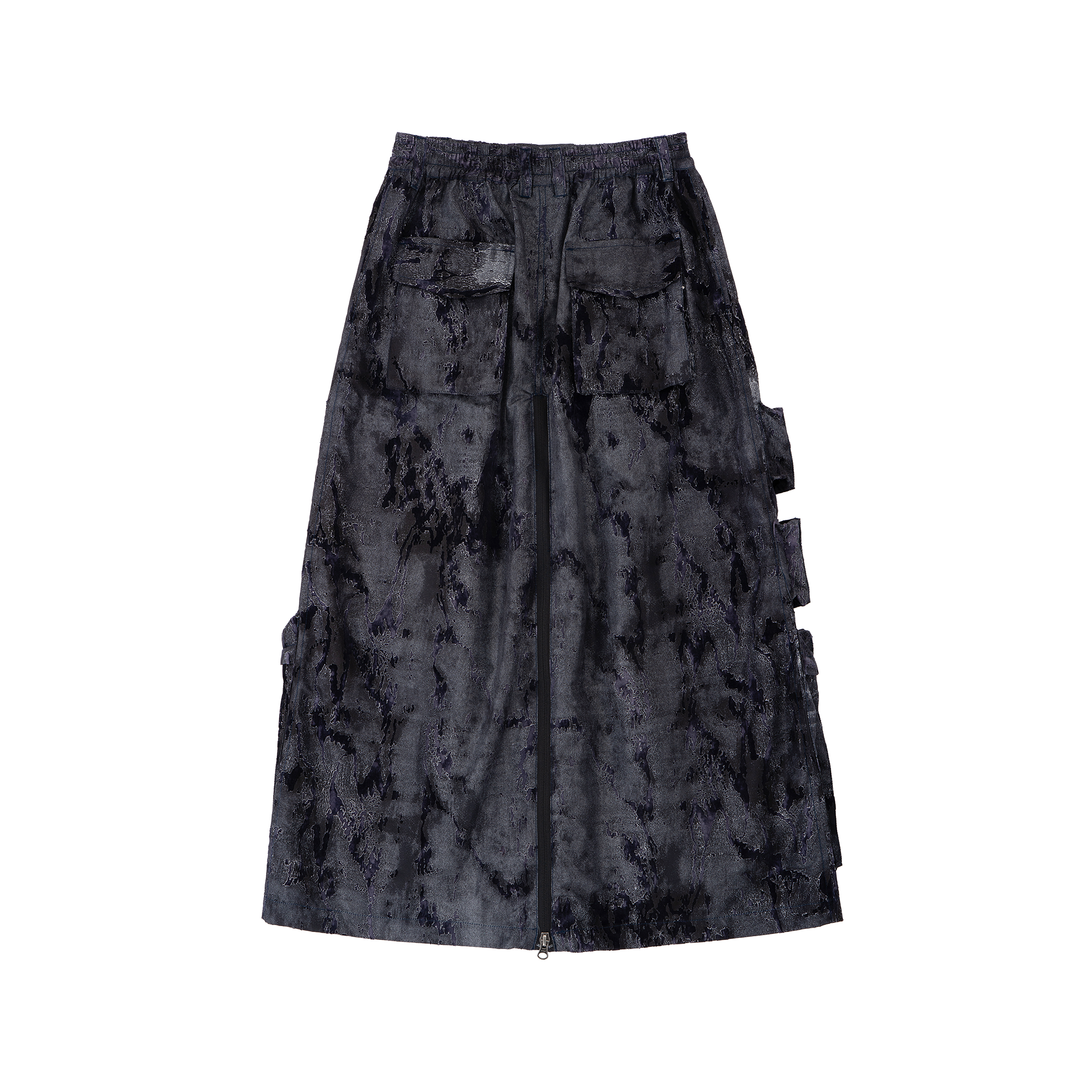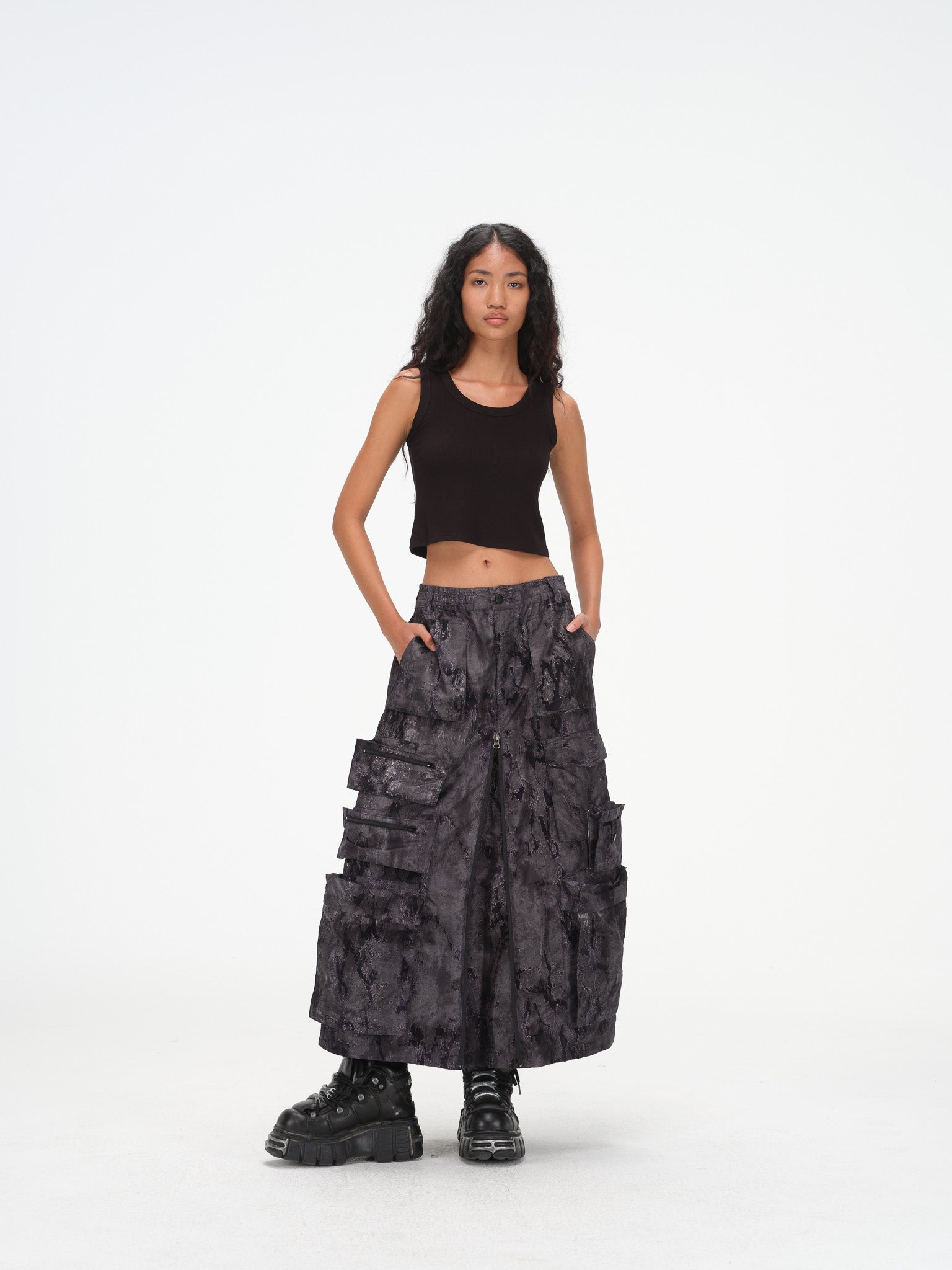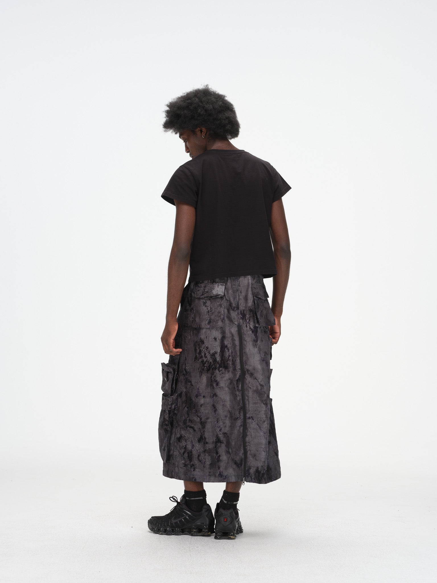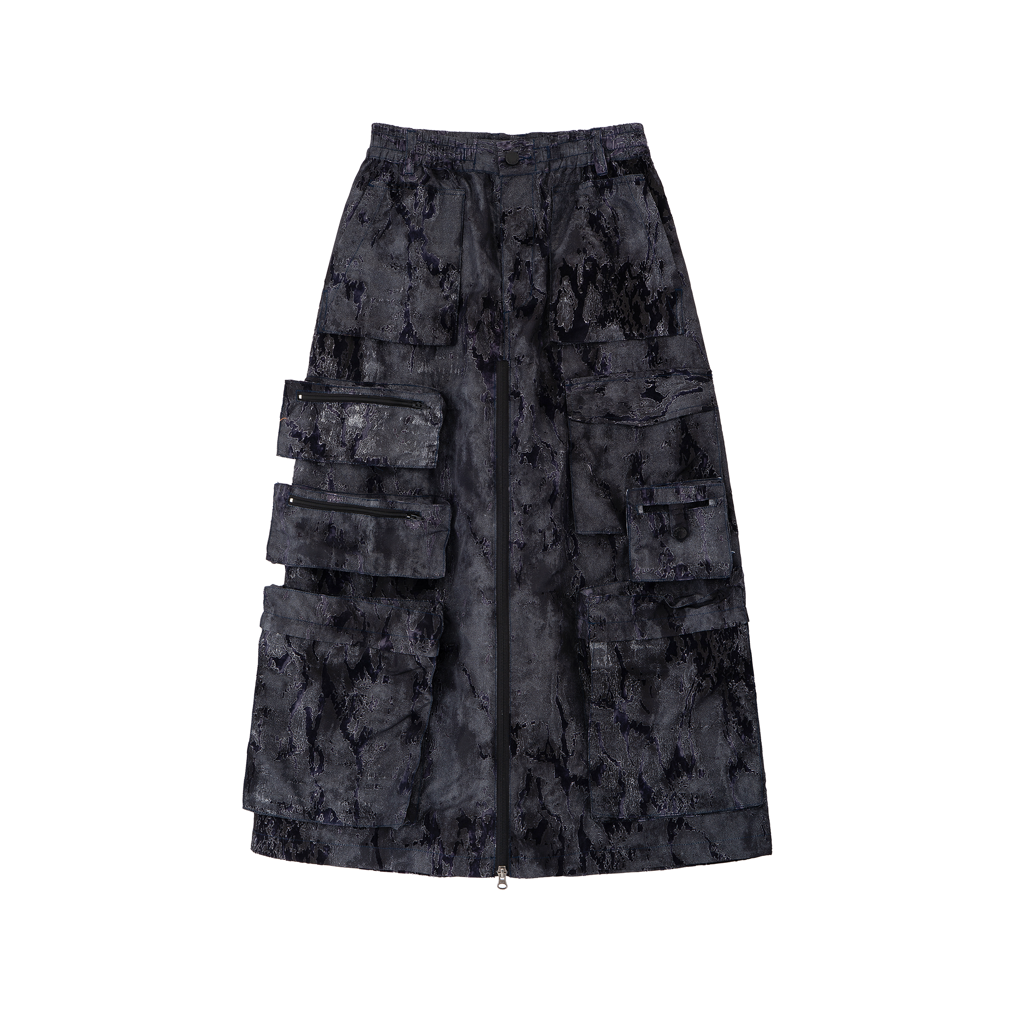 Midi-length cargo skirt in an abstract blue black textured jacquard fabric