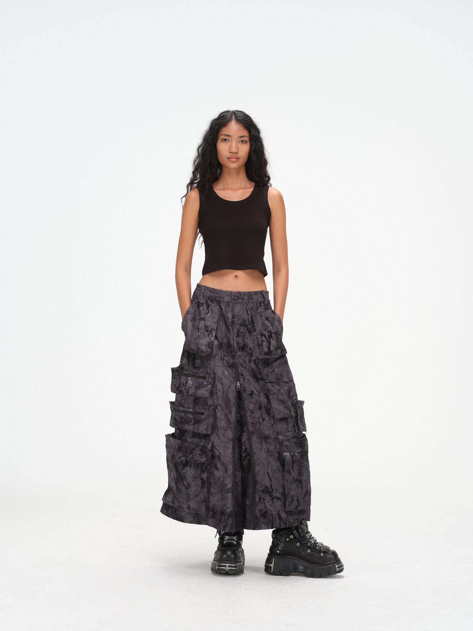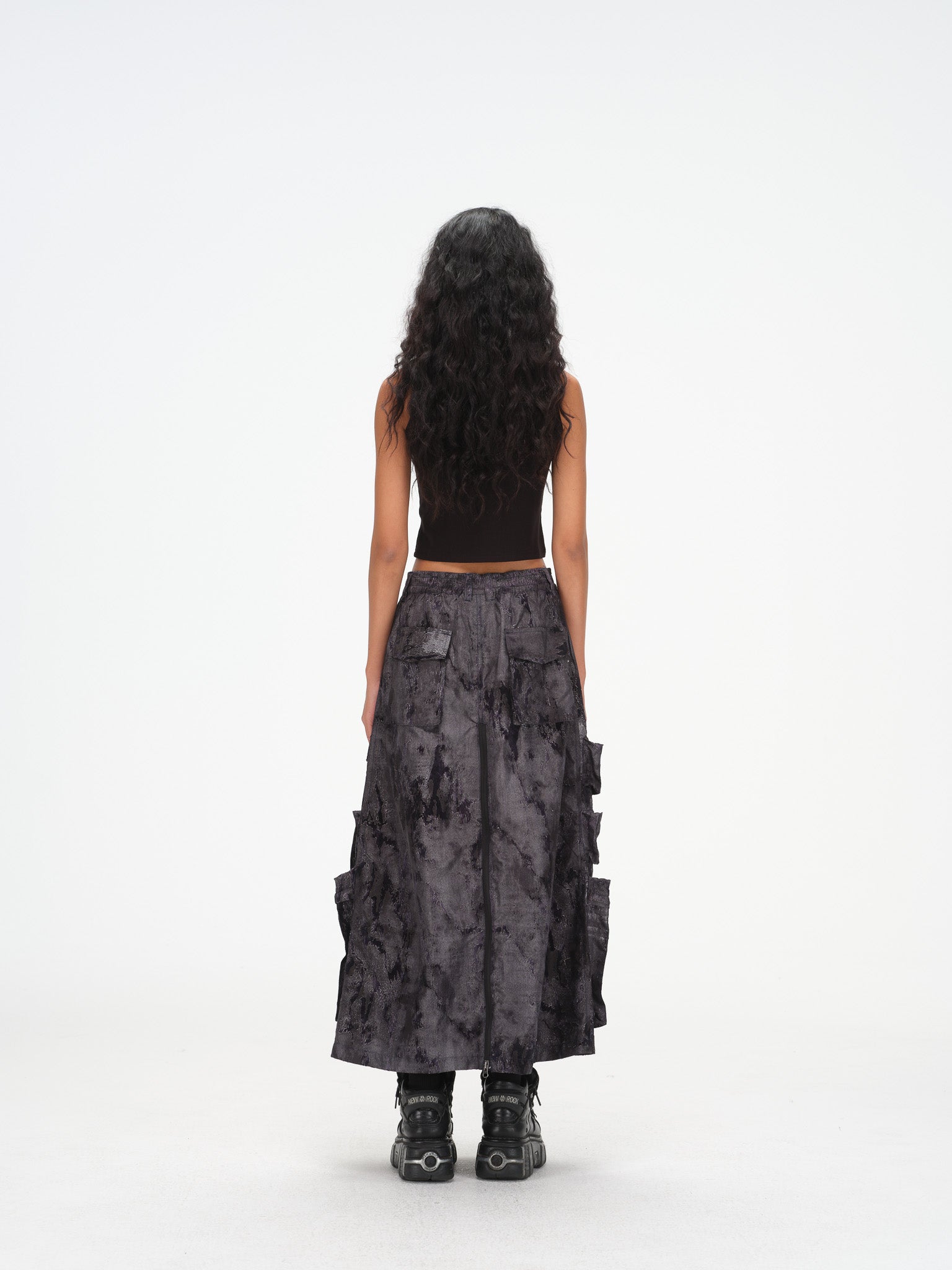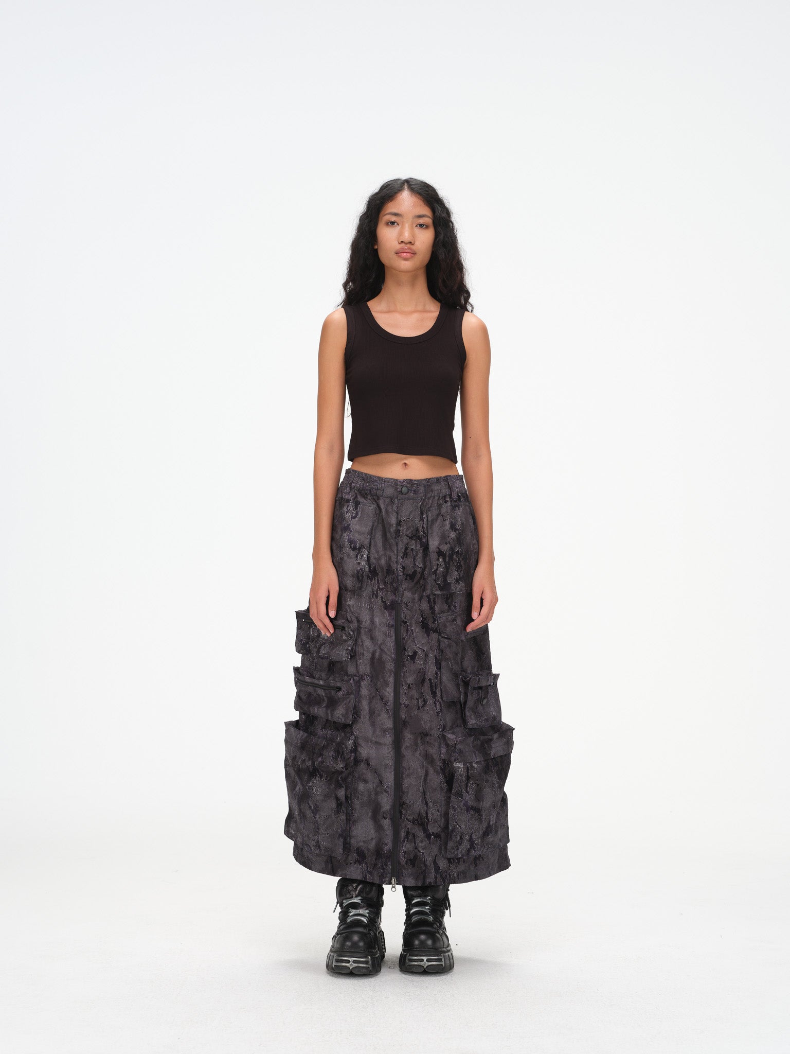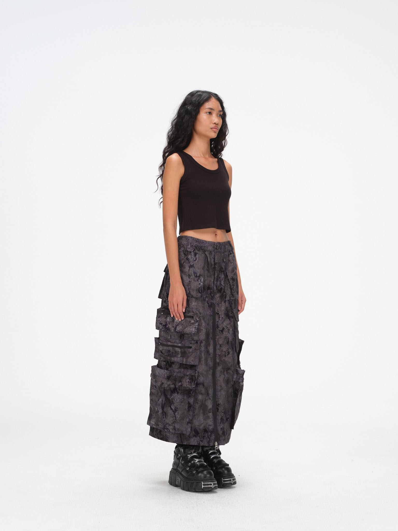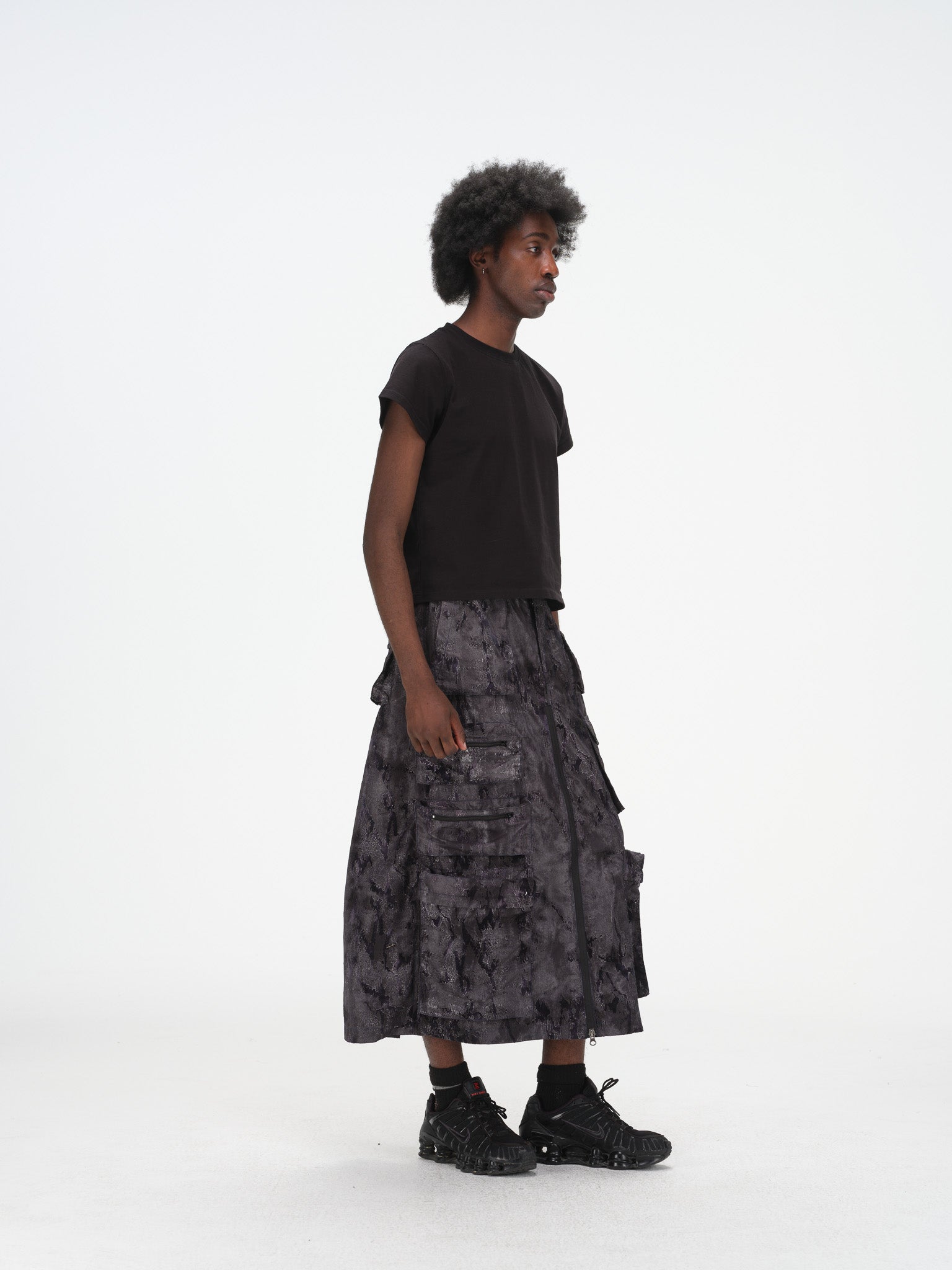 Midi-length cargo skirt in an abstract blue black textured jacquard fabric
