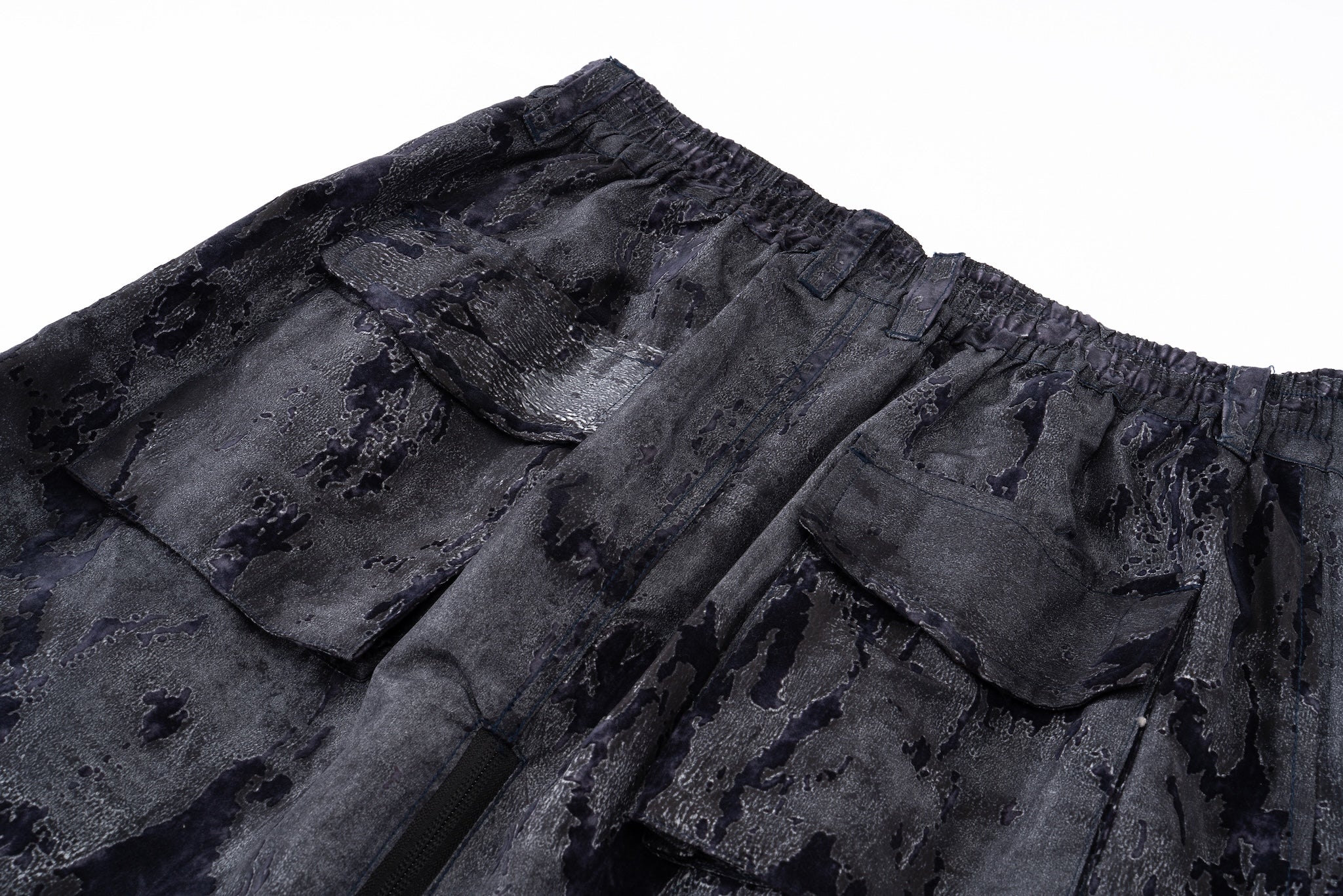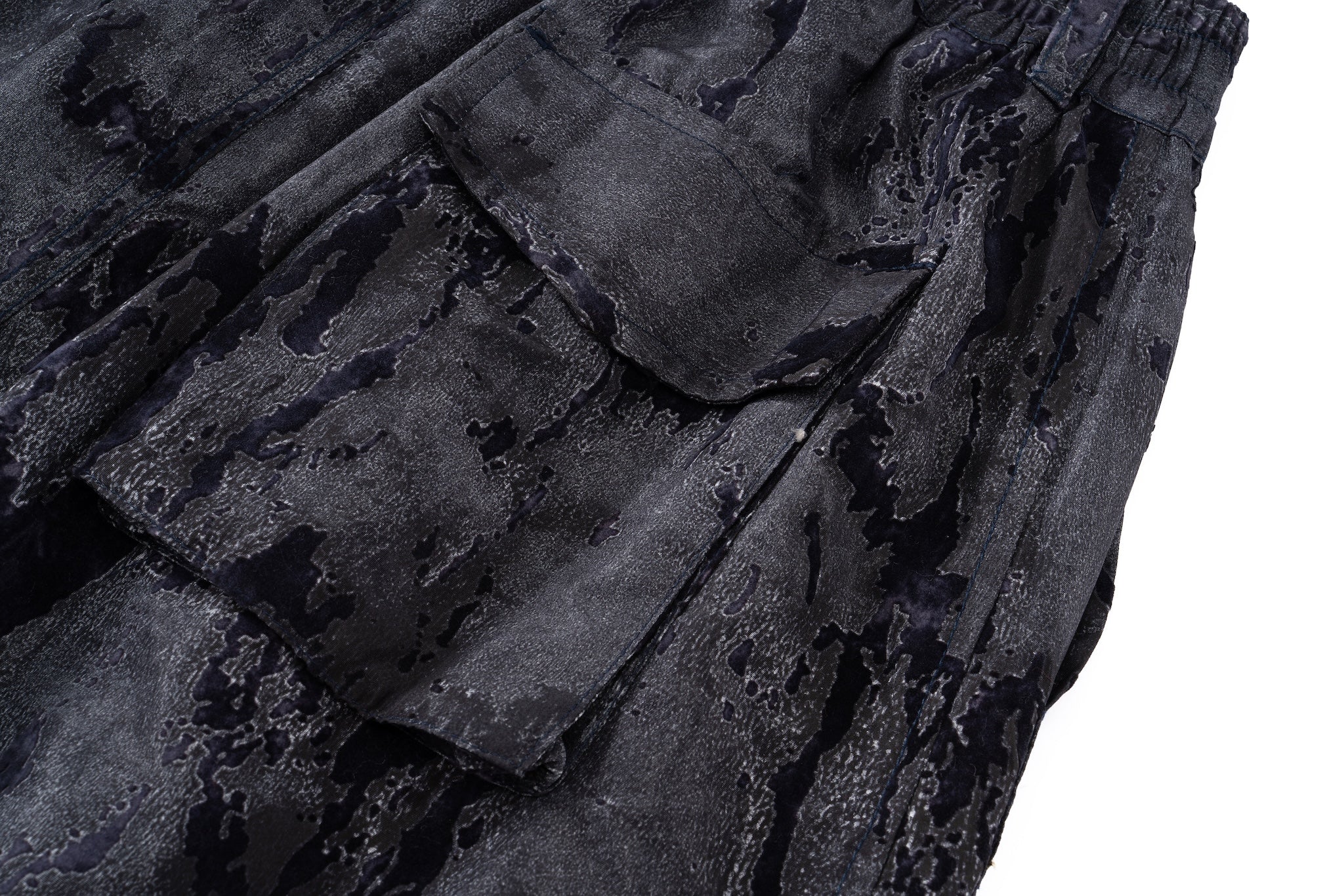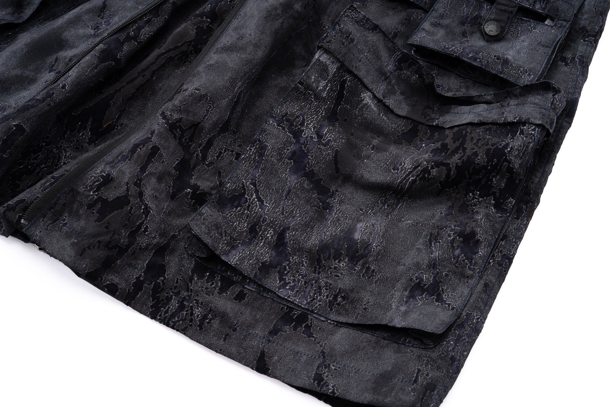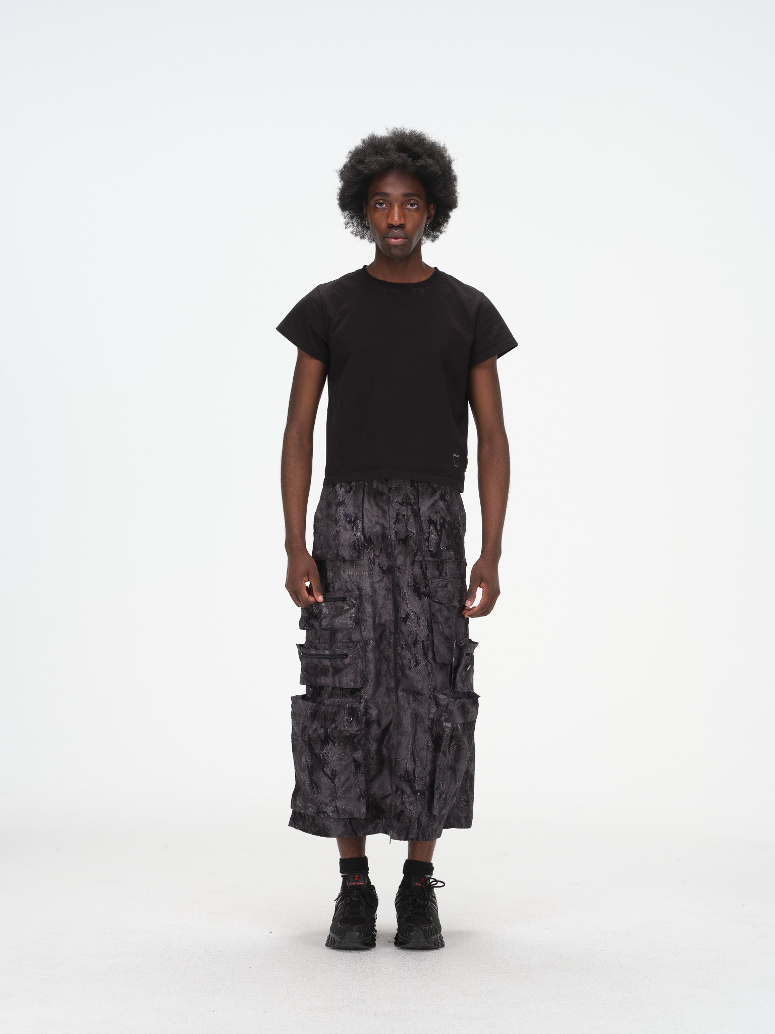 Midi-length cargo skirt in an abstract blue black textured jacquard fabric